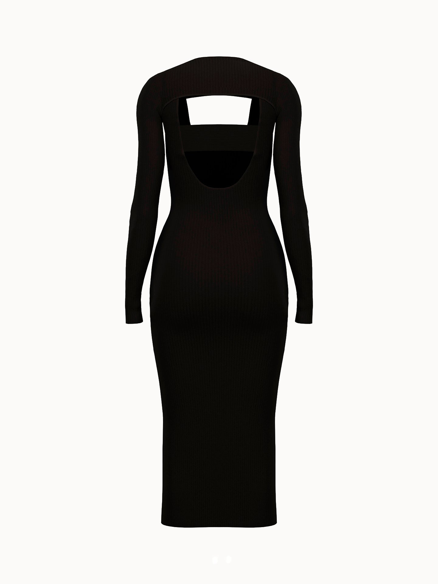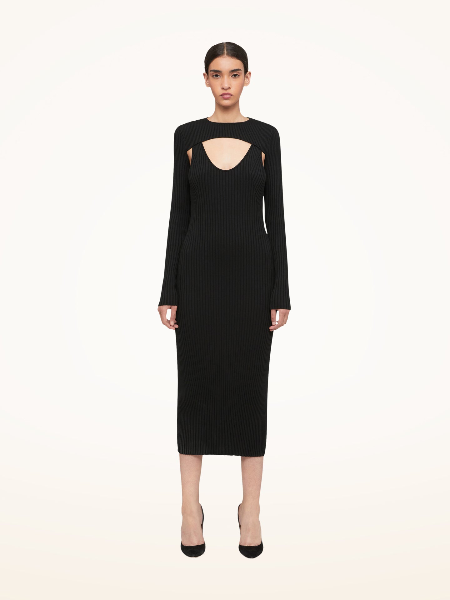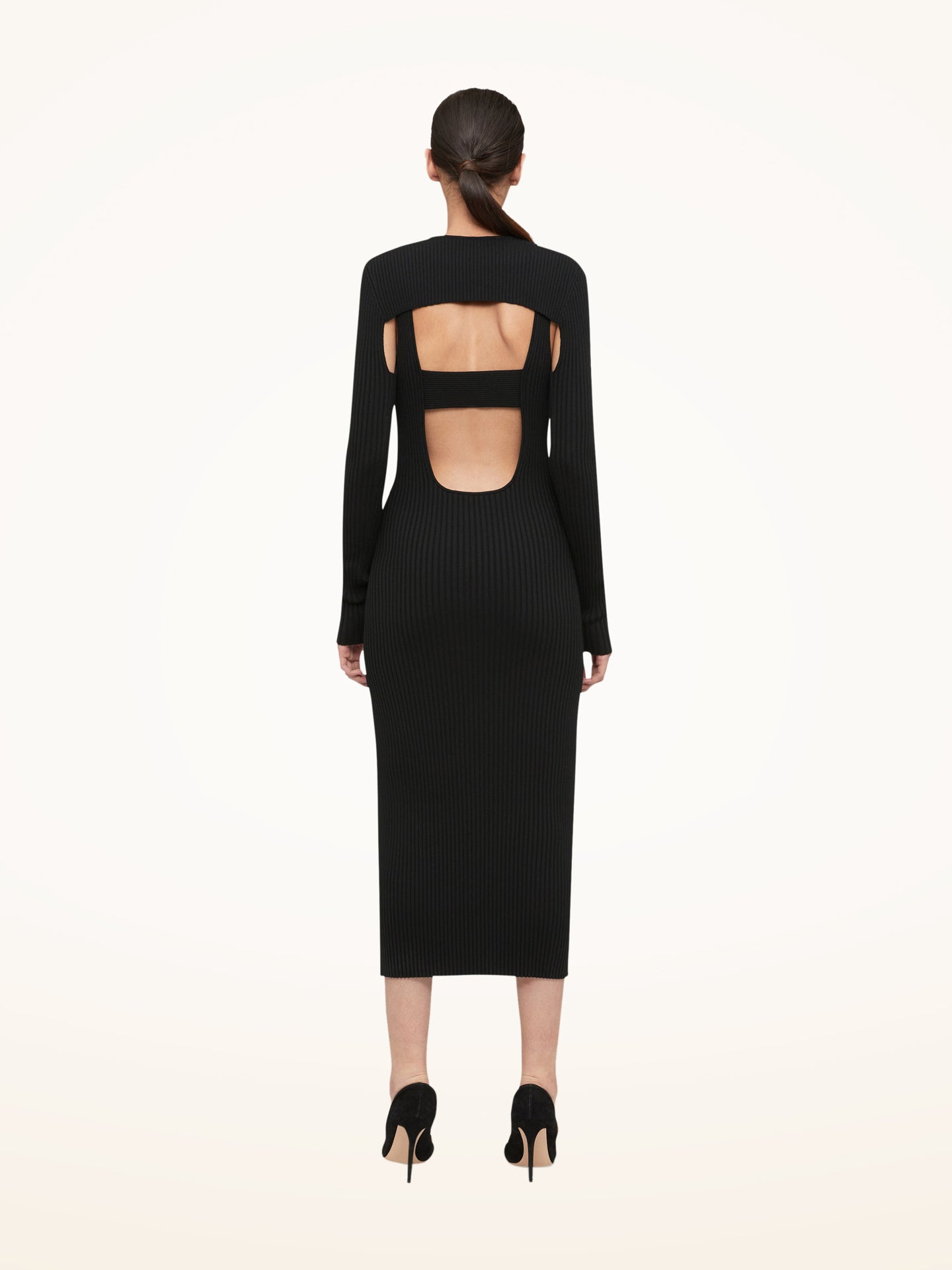 Deep cut-outs create the dress's plunging neckline and an open back, framed by a long-sleeved shrug. A ribbed pattern highlights the high-quality wool, which is lined with soft cotton. The mid-calf dress skims the body for a flattering fit.