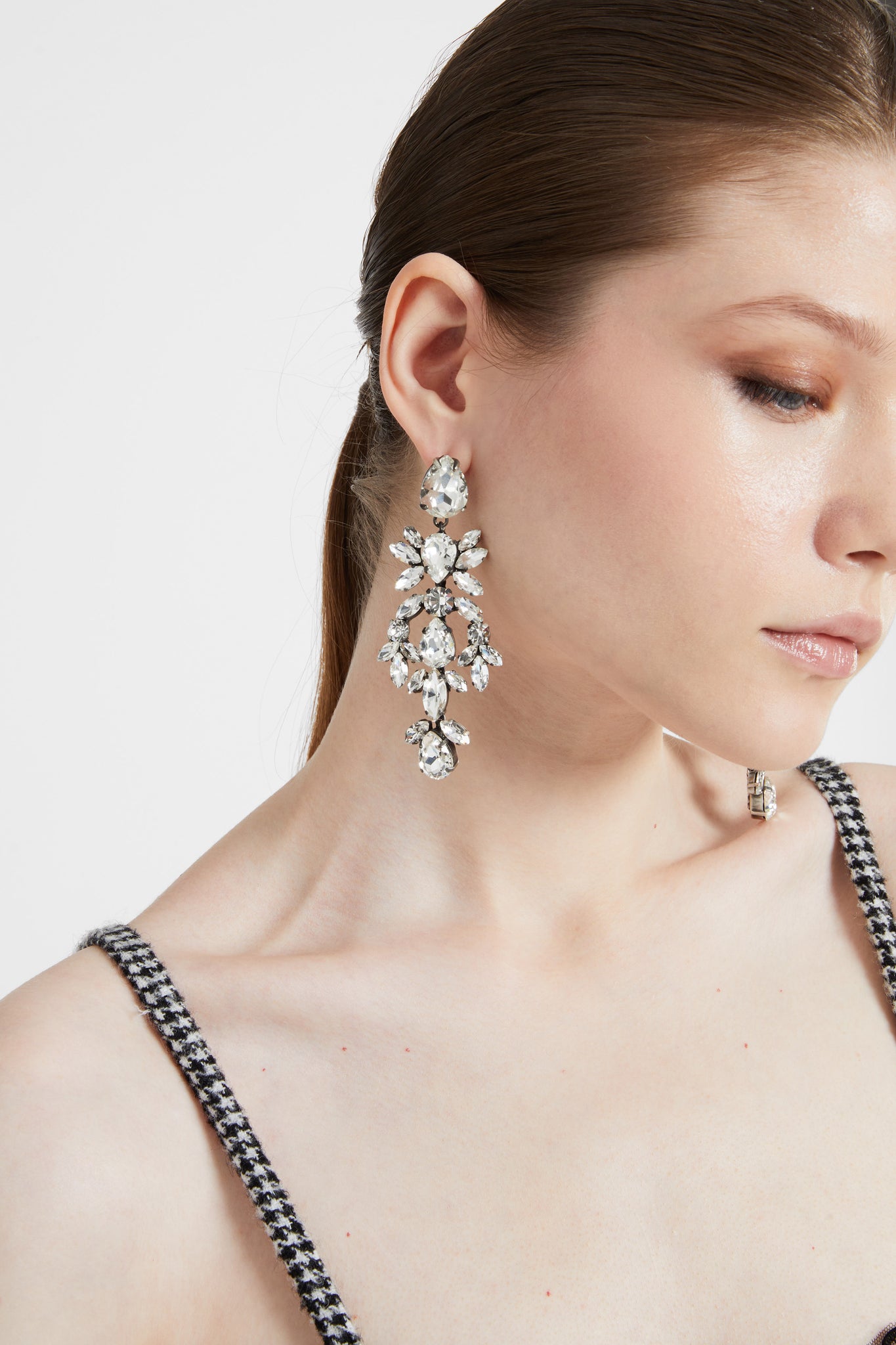 Inspired by the opulence of vintage jewellery, these chandelier earrings express a bold and theatrical femininity. Synthetic stones in marquise and teardrop cuts are set on a lightweight frame that gracefully follows the movement ofThe face, adding light and allure. Ideal for elevating eveningwear with a modern sense of drama.