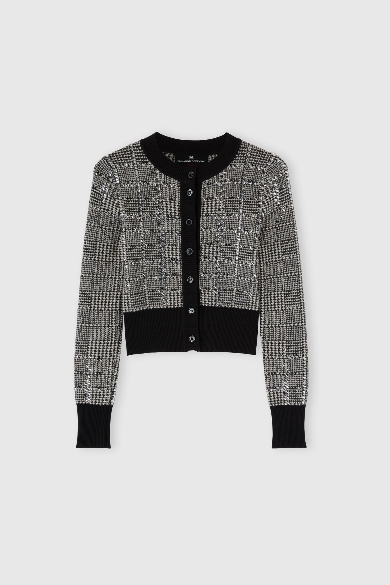 This cardigan, crafted from a refined blend of virgin wool and merino wool, revisits the iconic micro pied de poule motif and intertwines it with a graphic Prince of Wales-inspired design. The special jacquard weave plays with texture and contrast, echoing the maison’s archival fabrics with a modern twist. Crystals are applied to highlight the graphic motif, adding calibrated points of light.