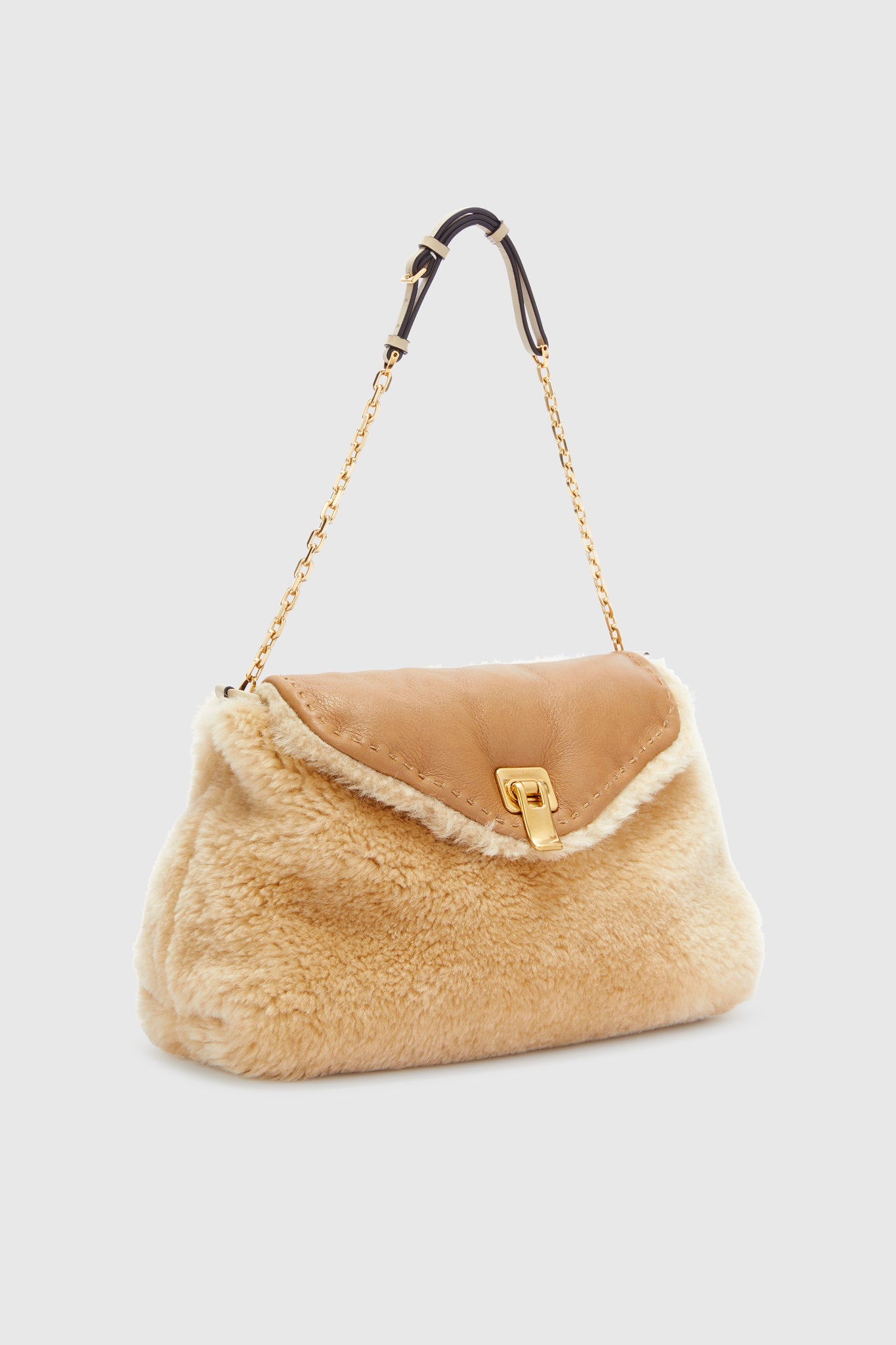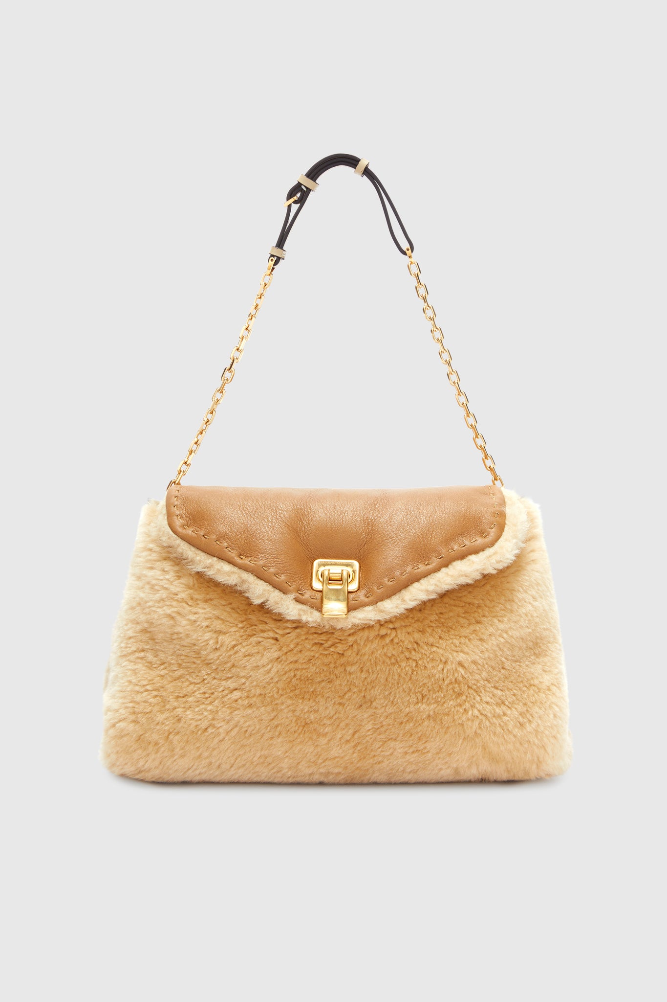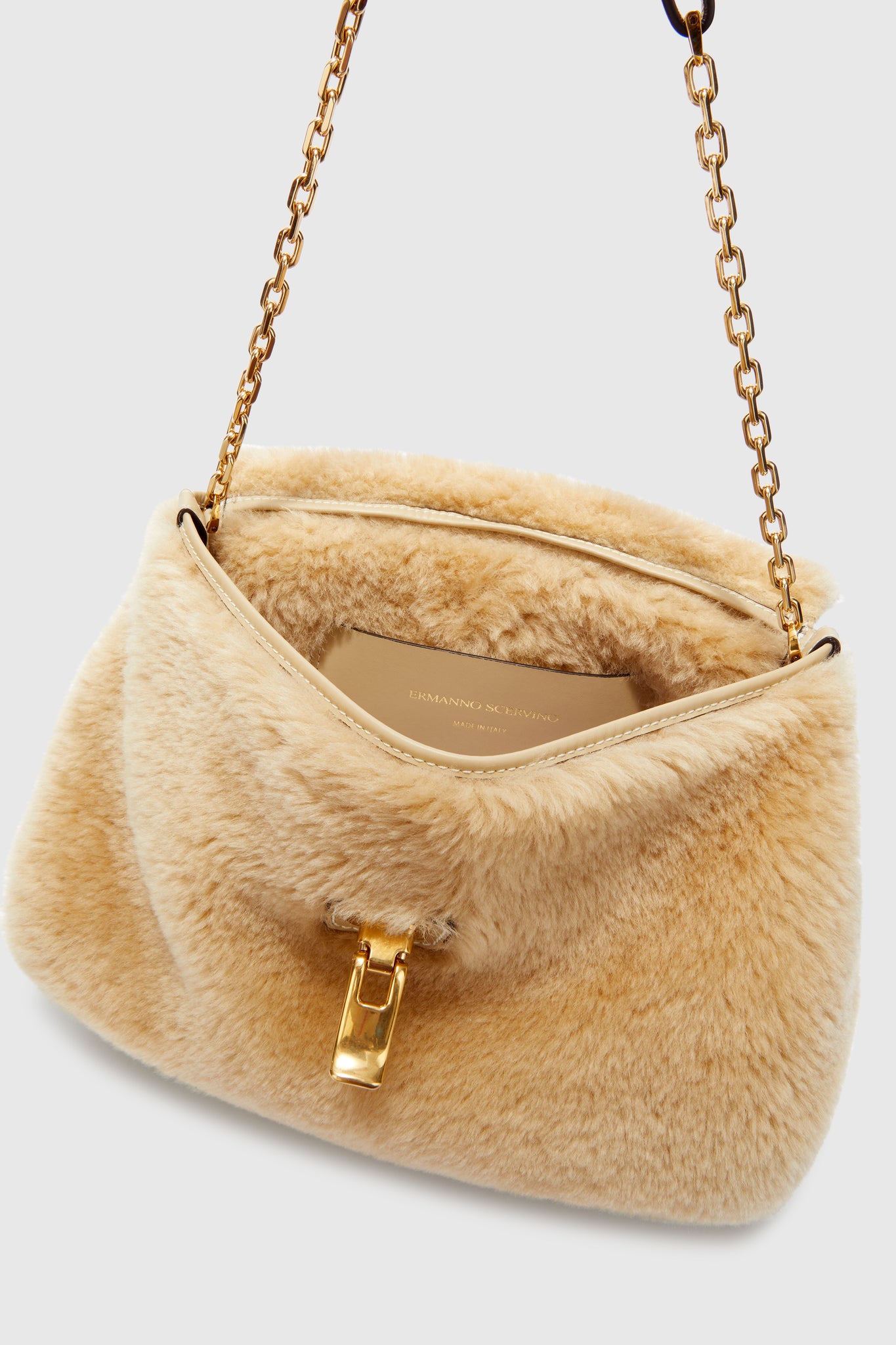 A new idea of elegance takes shape in Joy, the debut handbag by Ermanno Scervino forThe fW25/26 collection, first introduced in the pre-collection. Crafted from ultra-soft unlined shearling—with the body in natural fleece side andThe flap in smooth suede side—Joy blends refined materials with a clean, sophisticated design. The shiny chain handle adds a modern touch, while the new clip closure and signature half-sphere logo feet highlight the meticulous craftsmanship. Worn by hand or on the shoulder, it brings warmth and sophistication to any winter look.
