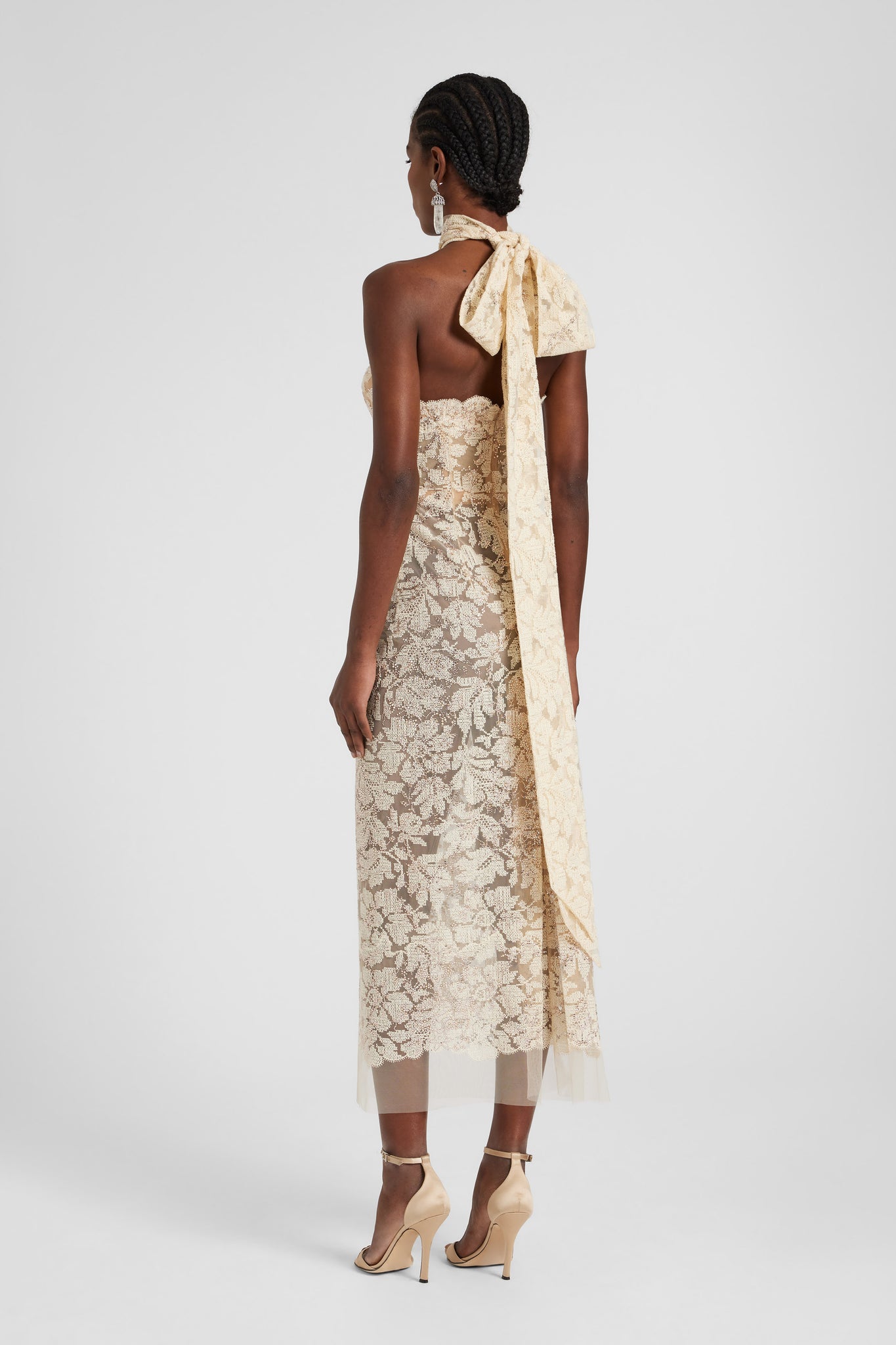 A timeless icon of Ermanno Scervino’s vision of femininity, the midi bustier dress returns toThe fW2526 runway in a precious new version. Crafted entirely from exclusive small-point floral lace and adorned with hand-applied crystals, it celebrates the maison’s signature craftsmanship.