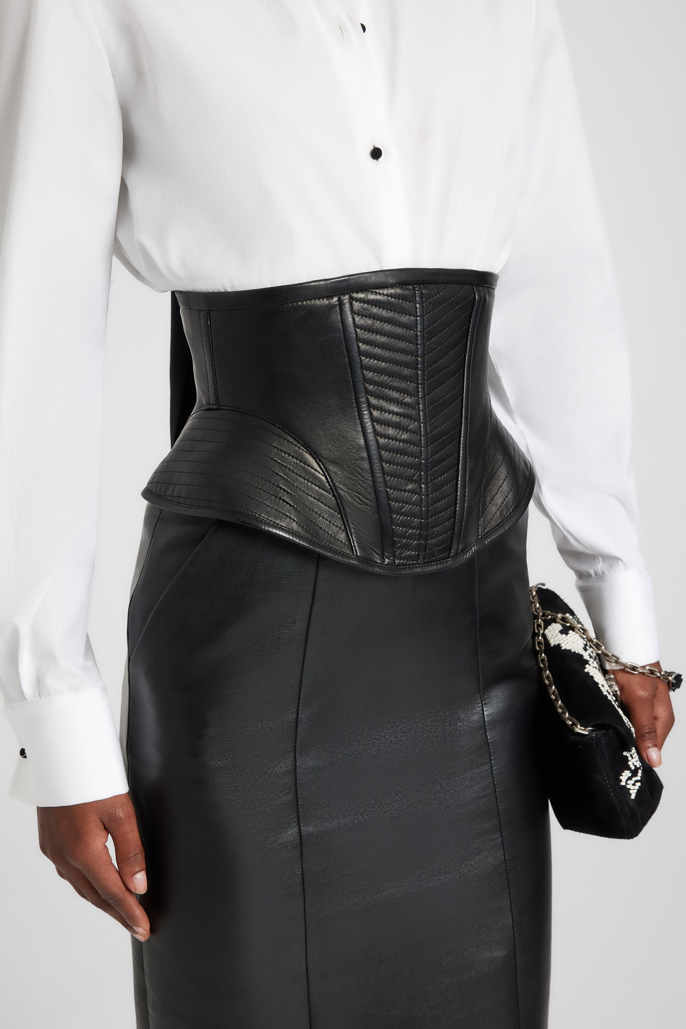 Bold, sensual, and sartorial: this leather corset embodies Ermanno Scervino’s DNA with confidence and femininity. Designed to define the waist and hips, it features a distinctive padded construction that echoes 19th-century corsetry reinterpreted with a modern twist. At the back, two leather straps are elegantly braided, while a hidden side zip ensures a flawless and practical closure. Seen onThe fW2526 runway, it was styled with a leather skirt and a crisp white poplin shirt with contrasting buttons—a look that celebrates empowered femininity.
