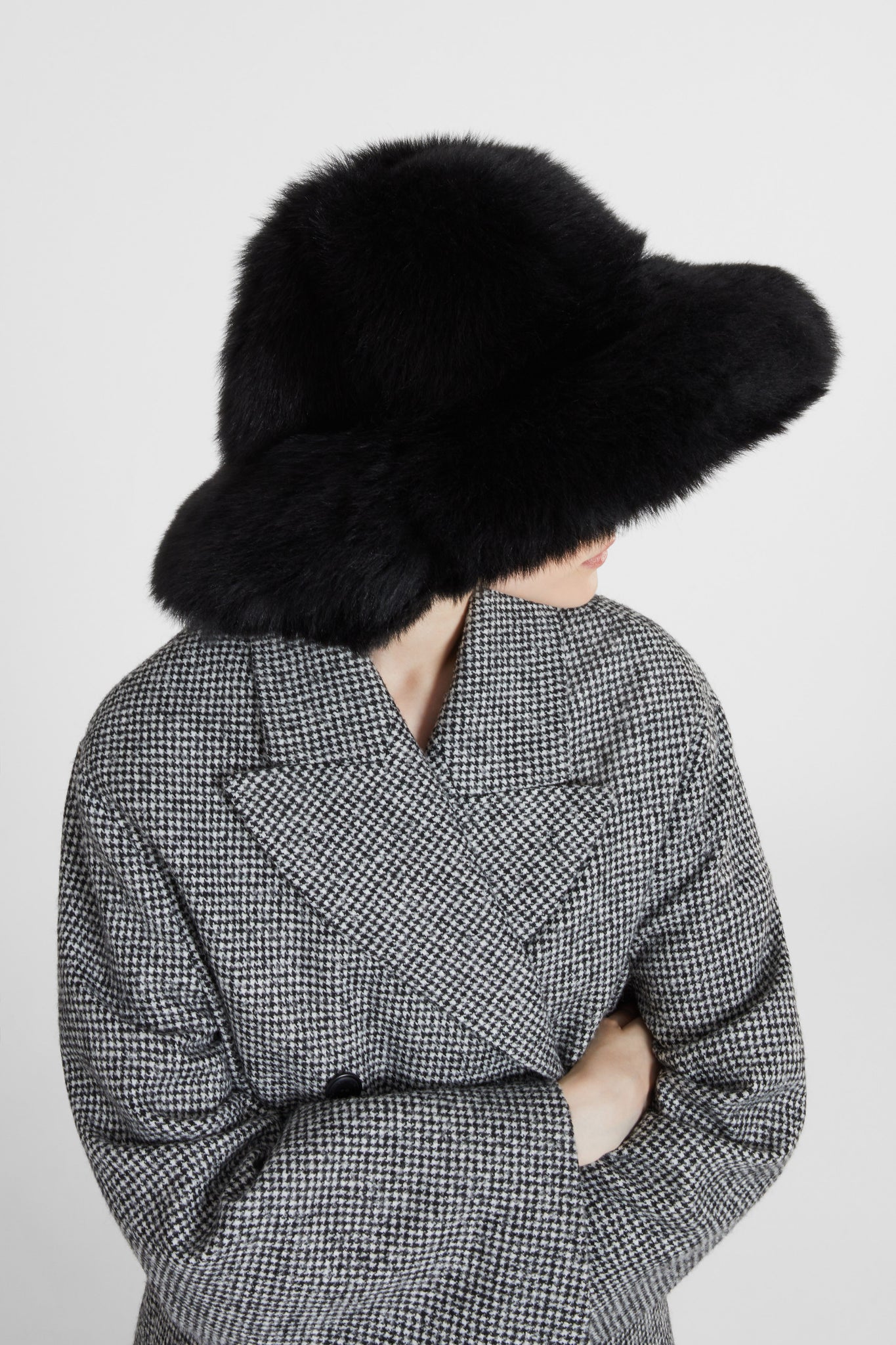 Soft lines and theatrical allure define the Pamela hat, a standout piece onThe fW25/26 runway. A contemporary take on the classic wide-brimmed silhouette, it is crafted from fox-effect shearling that adds volume, movement, and bold elegance.The fur-like texture creates a dramatic, enveloping frame aroundThe face, turning this hat into a true statement accessory.