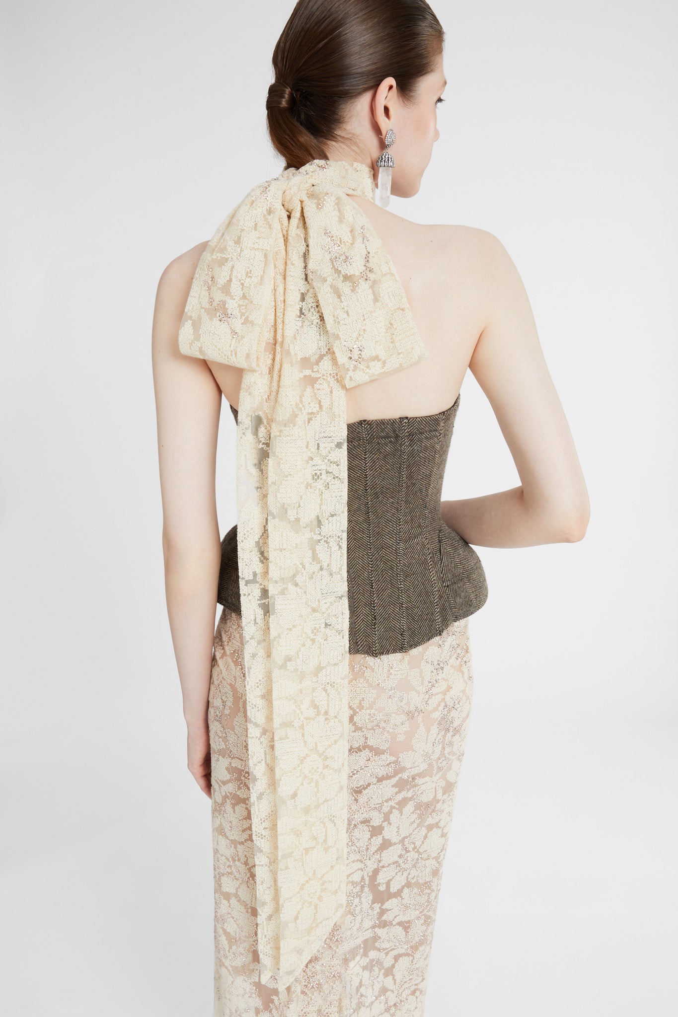 A symbol of refined elegance and exclusive craftsmanship, this scarf—entirely made from the new “piccolo punto” lace—is an iconic creation fromThe fall/Winter 2025–26 runway show. The delicate lace is enhanced by small tone-on-tone crystals that add light and texture toThe fabric. Designed as a distinctive styling accessory, it was worn on the catwalk tied around the neck and secured with a large bow at the back, with the ends falling freely along the back. A sophisticated and recurring detail, it complemented dresses and suits, becoming the true leitmotif of the collection.