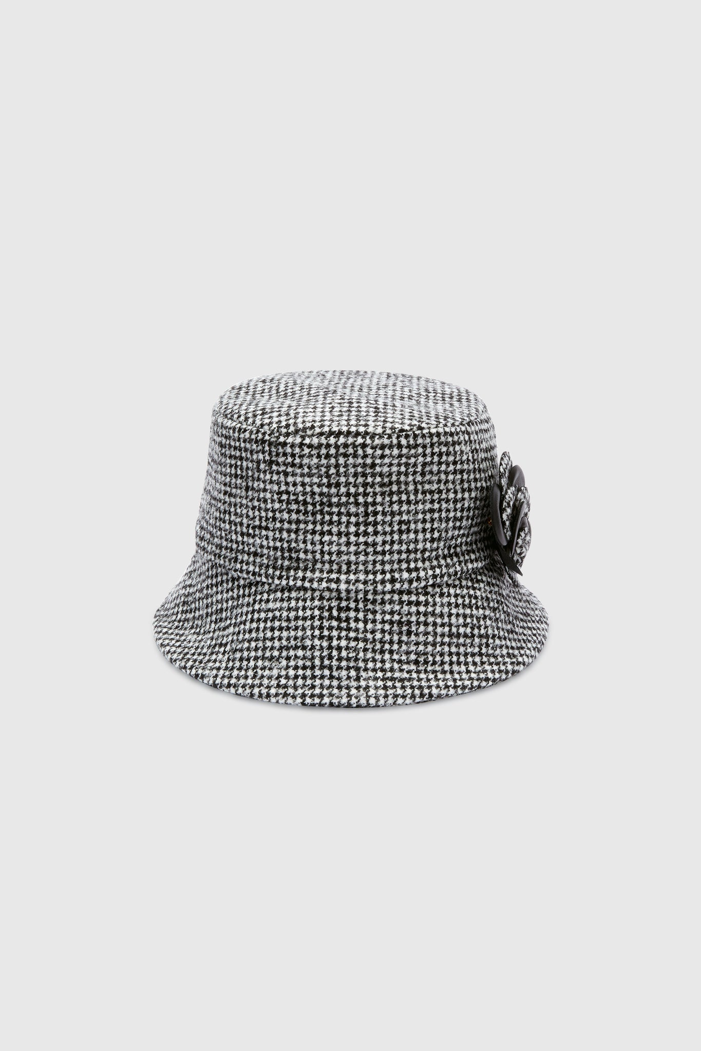 Retro charm meets couture refinement in this cloche hat crafted from pied de poule fabric, reinterpreted with a modern sensibility. The rich, dynamic weave brings depth and visual texture, while a floral appliqué in matching leather and fabric adds a sophisticated and iconic touch. Its soft, wraparound shape framesThe face with timeless femininity.