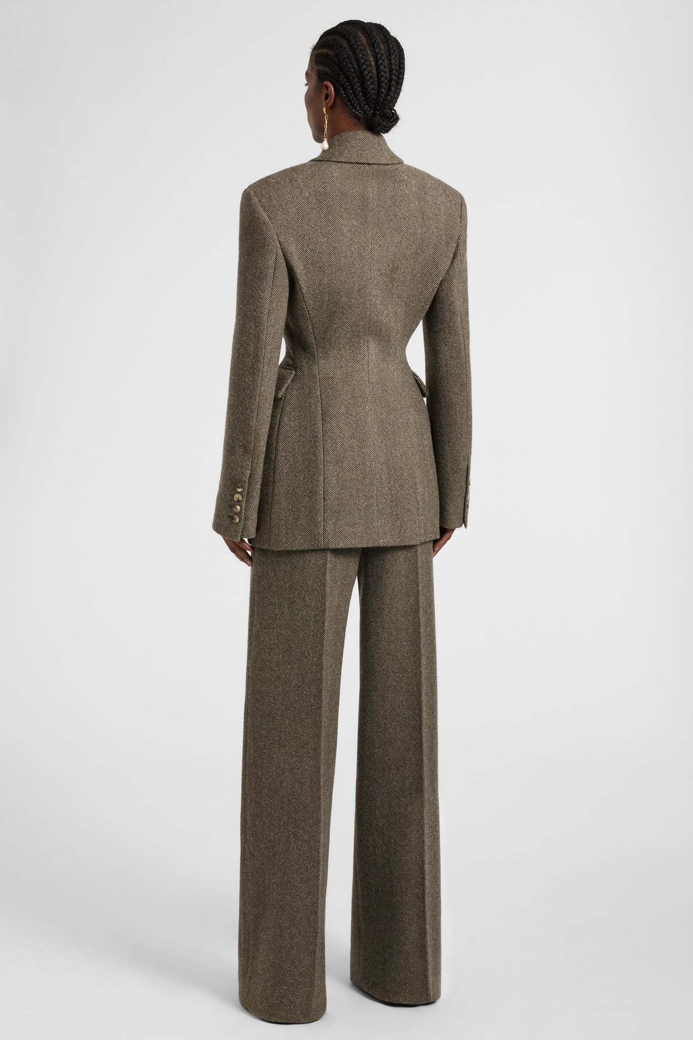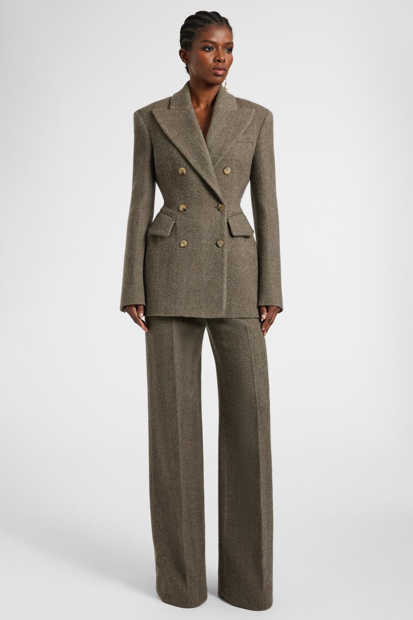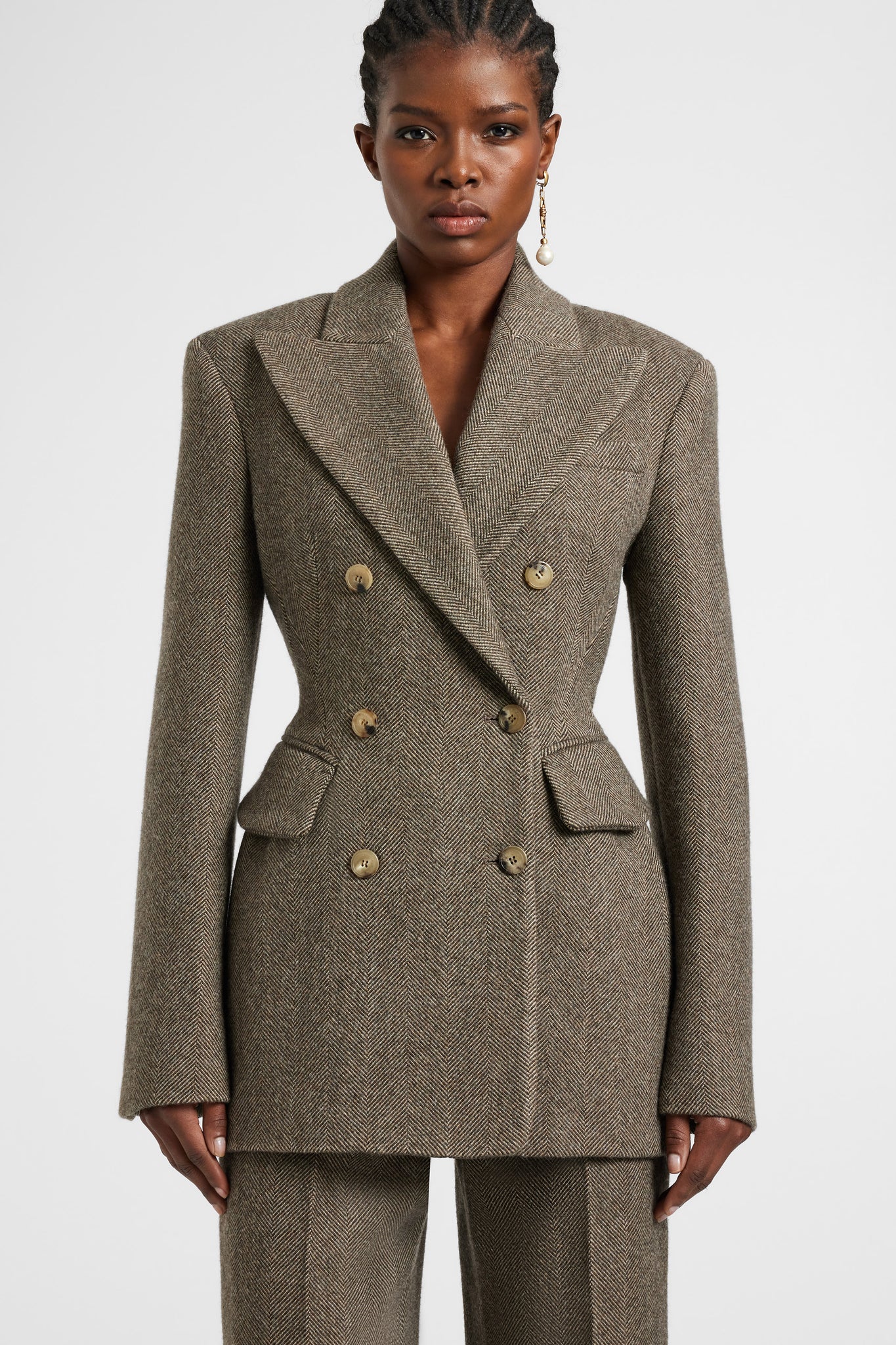 Sharp lines and sculptural proportions define this double-breasted jacket, a standout piece from the FW25/26 fashion show. Crafted from a refined blend of wool, silk and cashmere, it is enhanced by a sophisticated herringbone pattern that accentuates its graphic and structured appeal. The strong shoulders and architectural cut sculpt the silhouette, embodying the masculine/feminine contrast so dear to the Creative Director. Pair it with fitted trousers or fluid skirts for bold, distinctive looks.