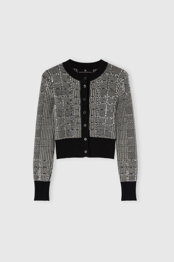 Jacquard wool cardigan with pied de poule pattern and crystals