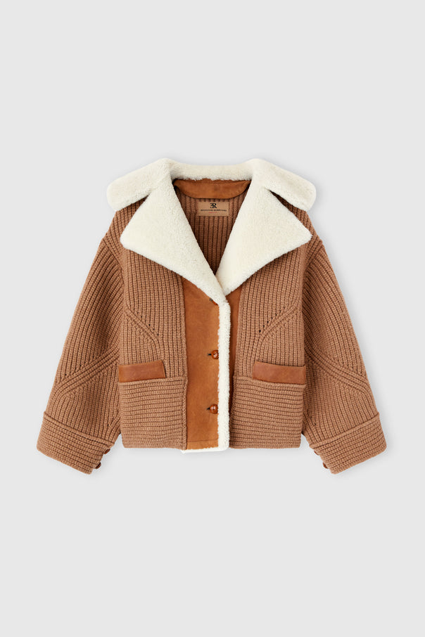 Oversized cardigan in merino wool blend with suede inserts and shearling collar