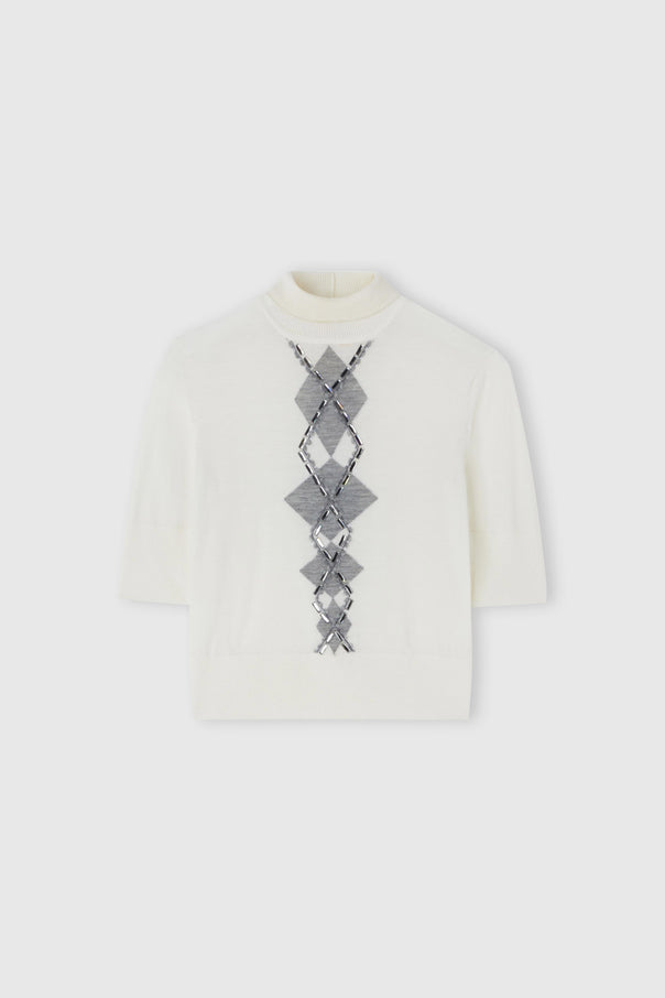 Alpaca and merino blend cardigan with diamond pattern and microcrystal logo