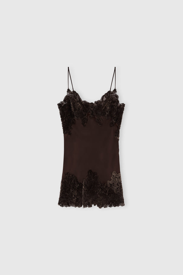 Lingerie-style velvet dress in viscose and silk with cutouts and rebrodé lace