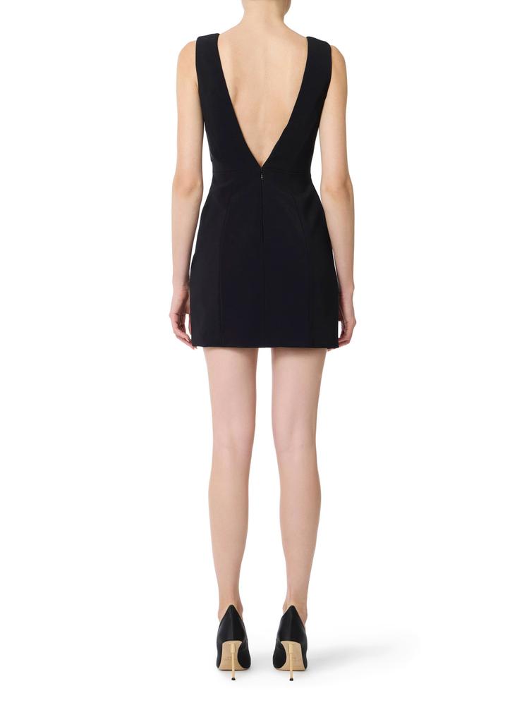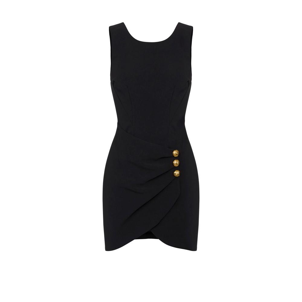 Stretch crêpe mini dress in a regular fit with a wraparound-effect construction. The dress is characterised by military-style buttons and draping that enrich the skirt, which has a slightly rounded volume. A sensual touch with the wide V-neck that leaves the back bare.