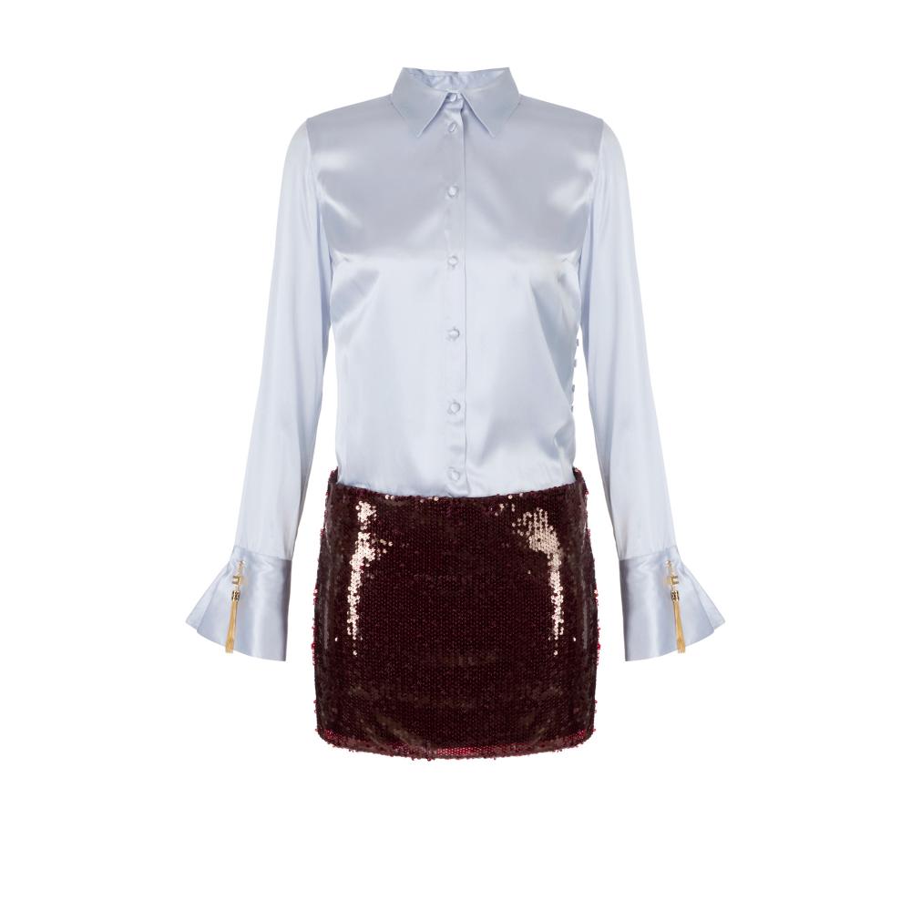 Dress made of satin shirt with classic collar and long sleeves, embellished with jewel logo cufflinks and dangling snake patterned tassels. The skirt is removable and features a full sequin texture that gives unique light. Slim fit.