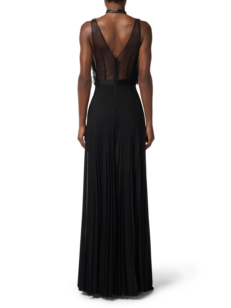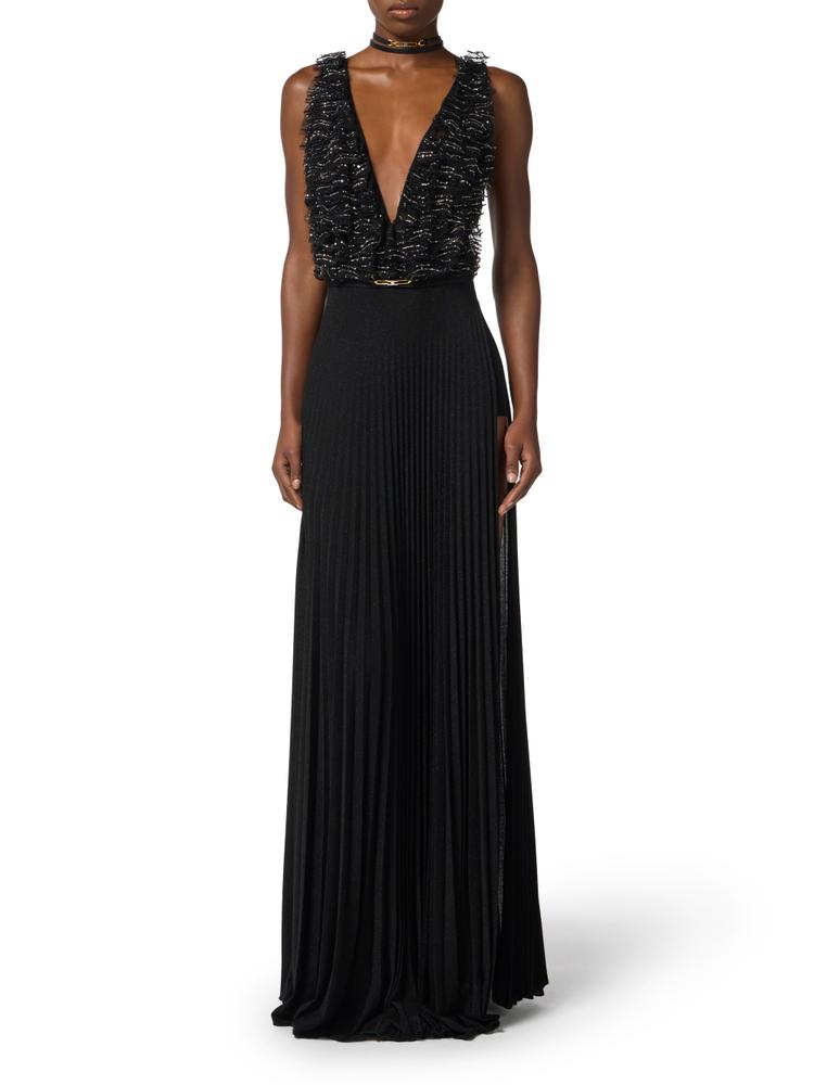 Evening dress with slim fit. The sleeveless dress features a top with small tulle flounces, illuminated by hand-embroidered crystals. The jersey skirt has a sunray pleating pattern with a striking deep slit. The jewel detail with logo and rhinestones decorates the waistline.