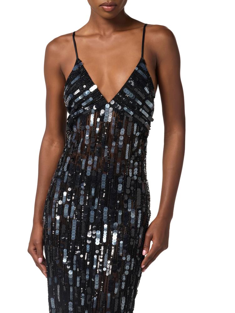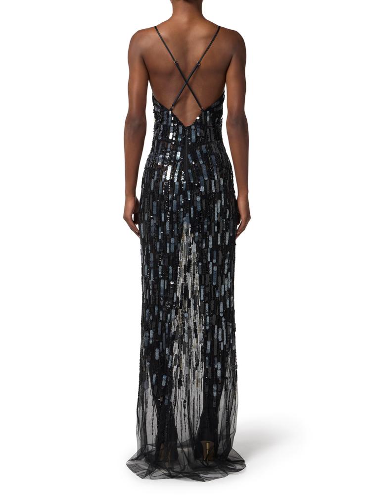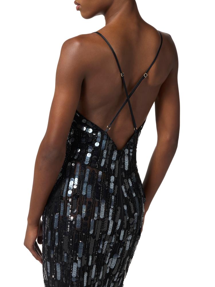 Dress in tulle fabric with slim fit. Inspired by the sensuality of slip dresses, the dress has thin straps crossed at the back and a long skirt. It is characterised by a texture with sequins embroidered with micro-macro patterns and crystals, fading into a delicate colour shading at the bottom of the garment.