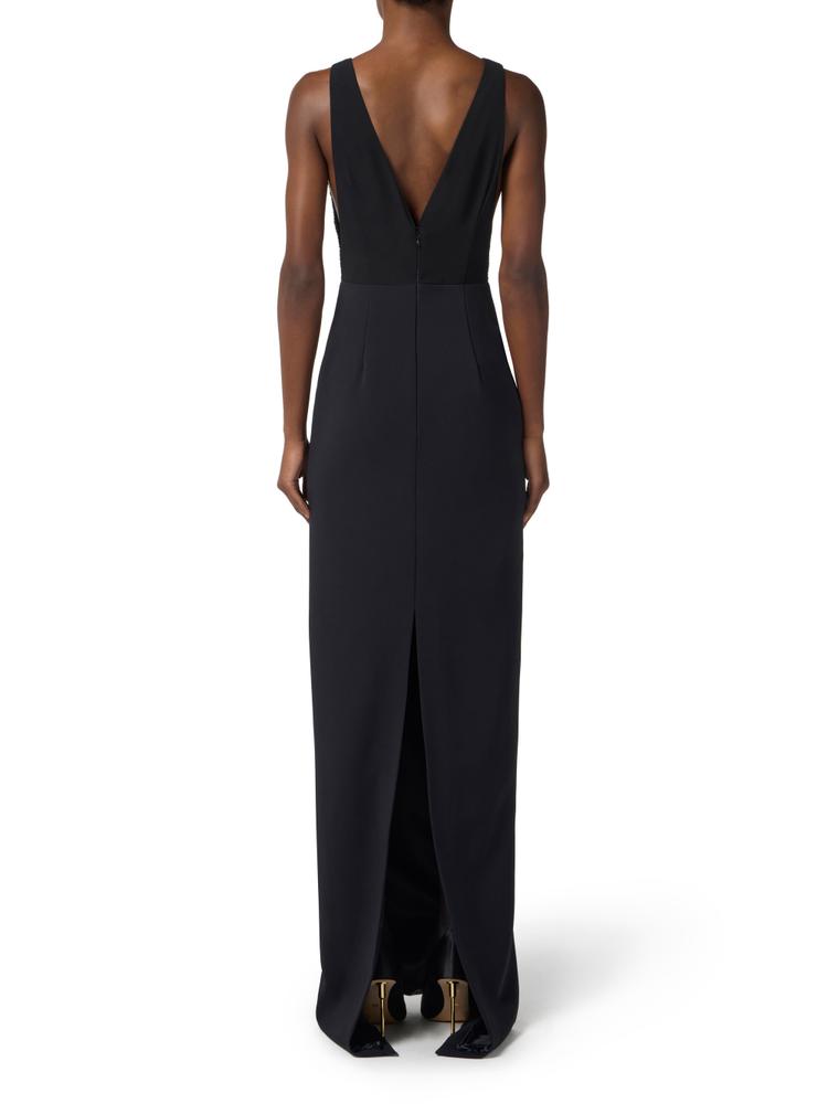 Evening dress in georgette fabric with slim fit. The dress is sleeveless with a plunging neckline and is embellished with a logo jewel detail. The top is decorated with embroidered crystals for a sparkling touch, while the skirt in crêpe fabric has a column line and a deep side slit for a bold silhouette.