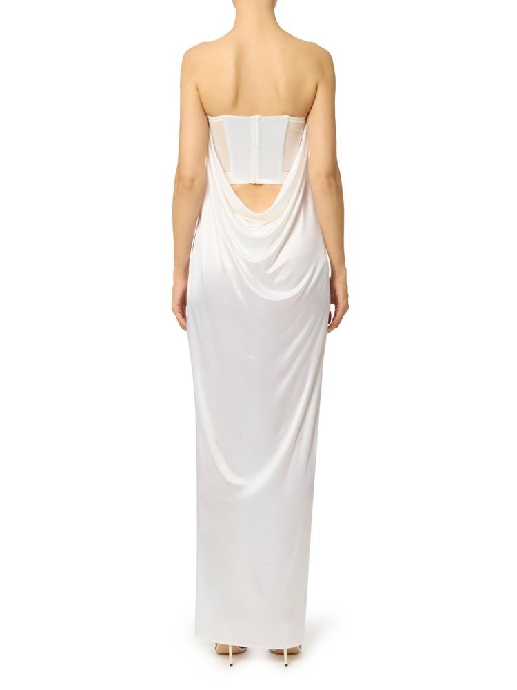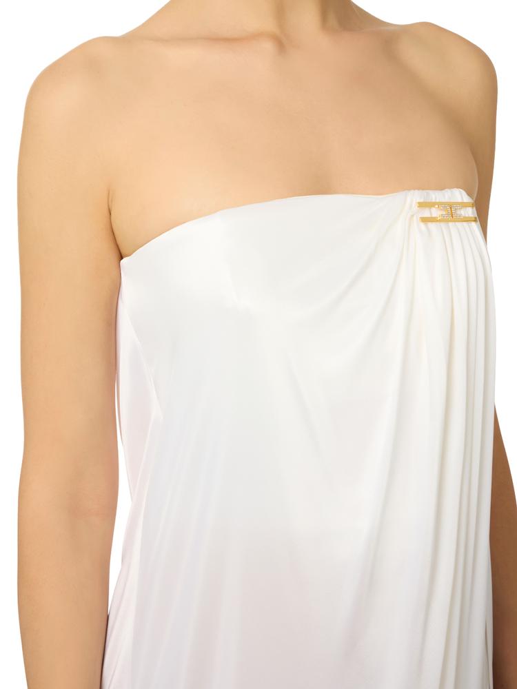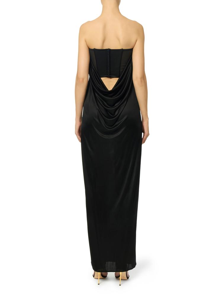 Evening dress in jersey fabric. The dress reveals bare shoulders and stands out for its bustier bandeau top in tulle that is revealed at the back. The side drape is held in place with a jewel plaque, creating harmonious volumes. The skirt with side slit gives an additional bold touch. Slim fit.