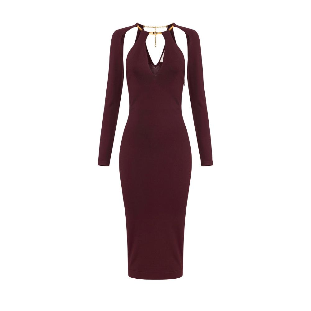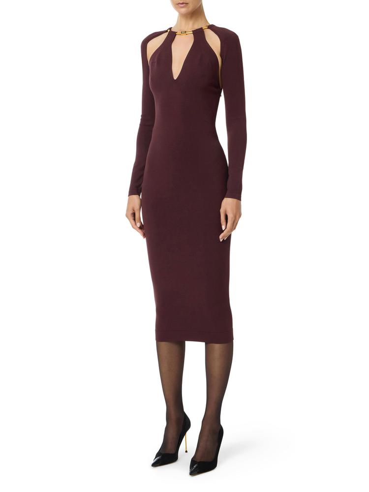 Knit top with a slim fit. The dress has a halter neck with plunging keyhole, long separated sleeves and a calf-length skirt. It stands out for the snake patterned necklace with logo, removable and flexible for many styling options.