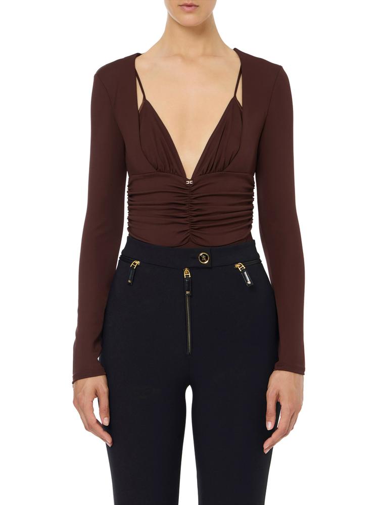 Bodysuit in crêpe jersey fabric with slim fit. It is characterised by the double neckline that reveals a triangle bra and the draped band that softly wraps around the waist. The straps at the back held in place by the logo detail reveal the back for a daring touch.