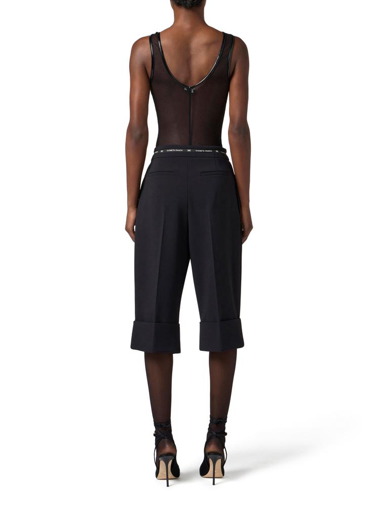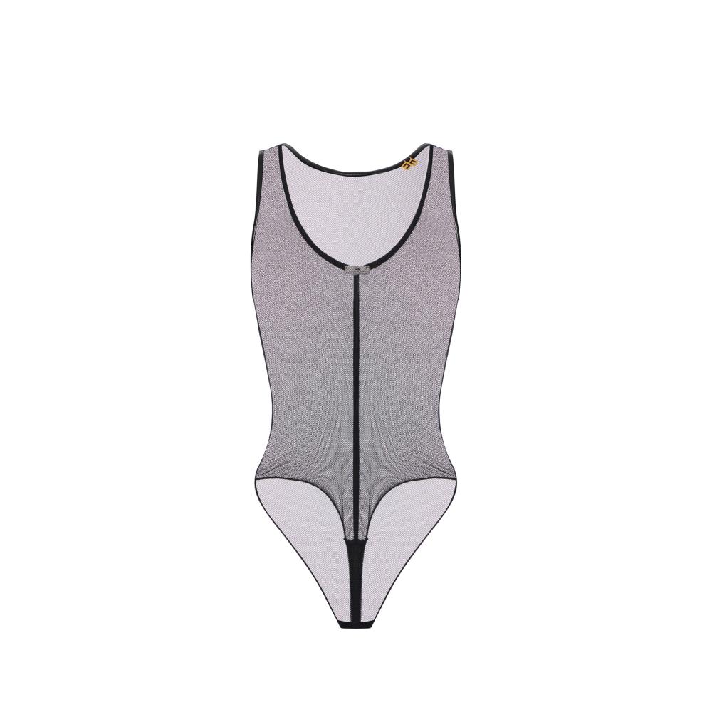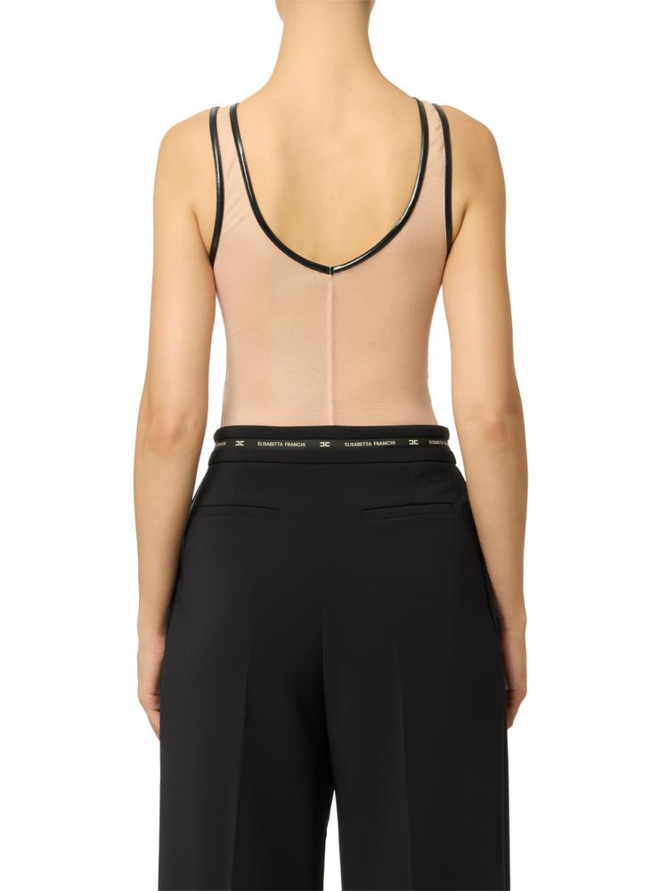 Bodysuit in mesh tulle fabric with slim fit. With a halter neck, it is embellished with vinyl details that give it a defined silhouette and a golden metal logo on one side.