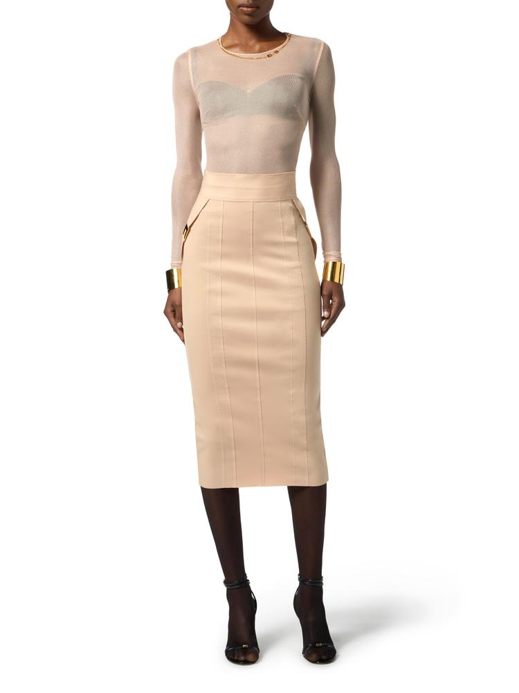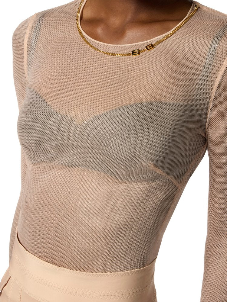 Bodysuit in mesh tulle fabric with slim fit. With a crew neck and long sleeves, it is embellished with a golden metal necklace with logo details, which is detachable for many styling options.