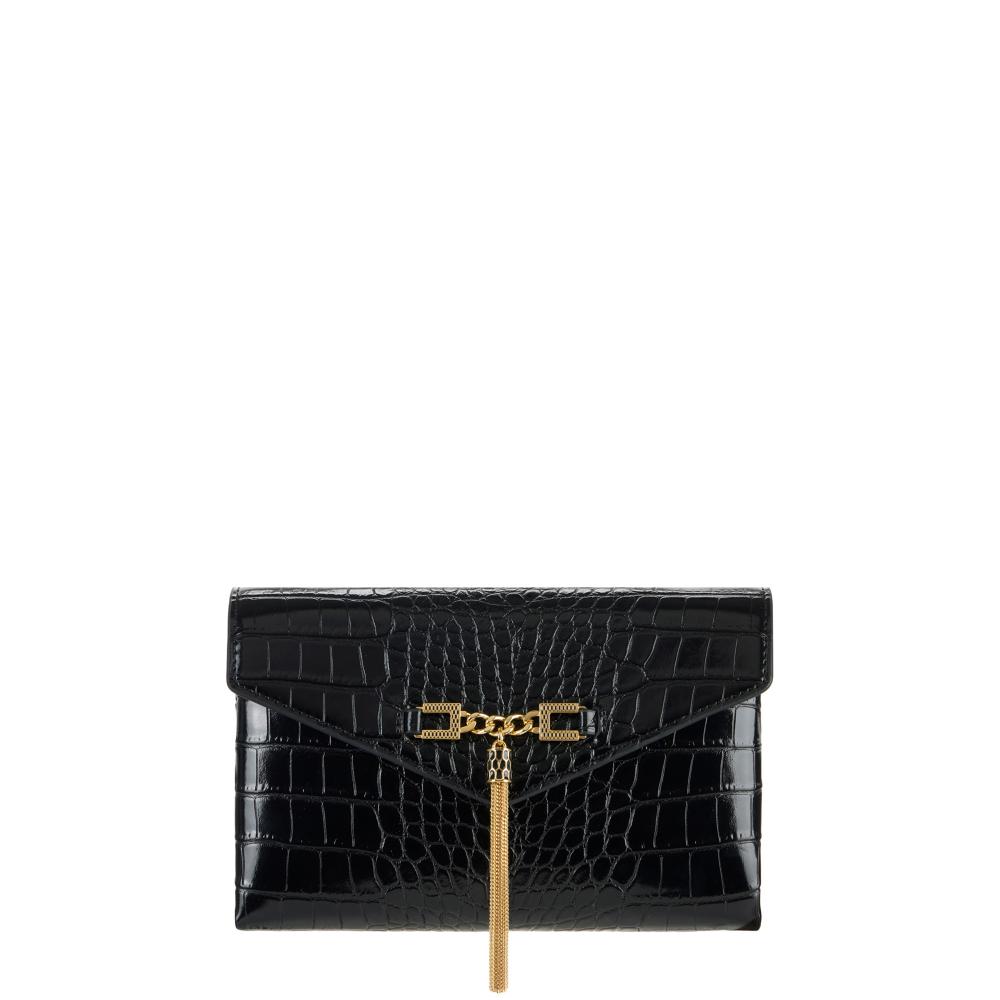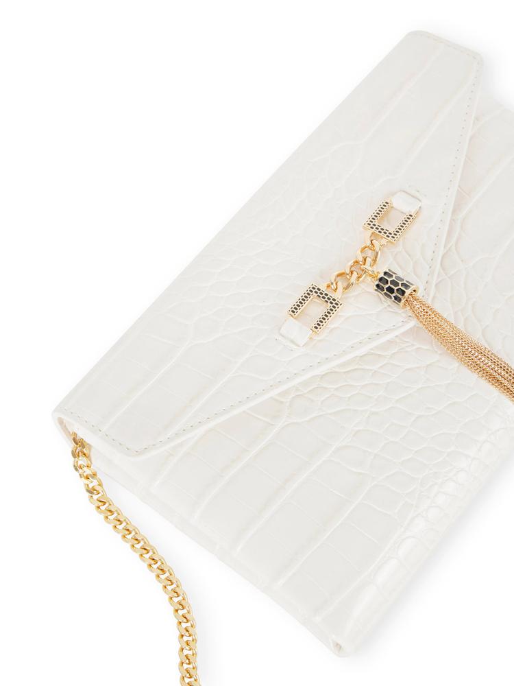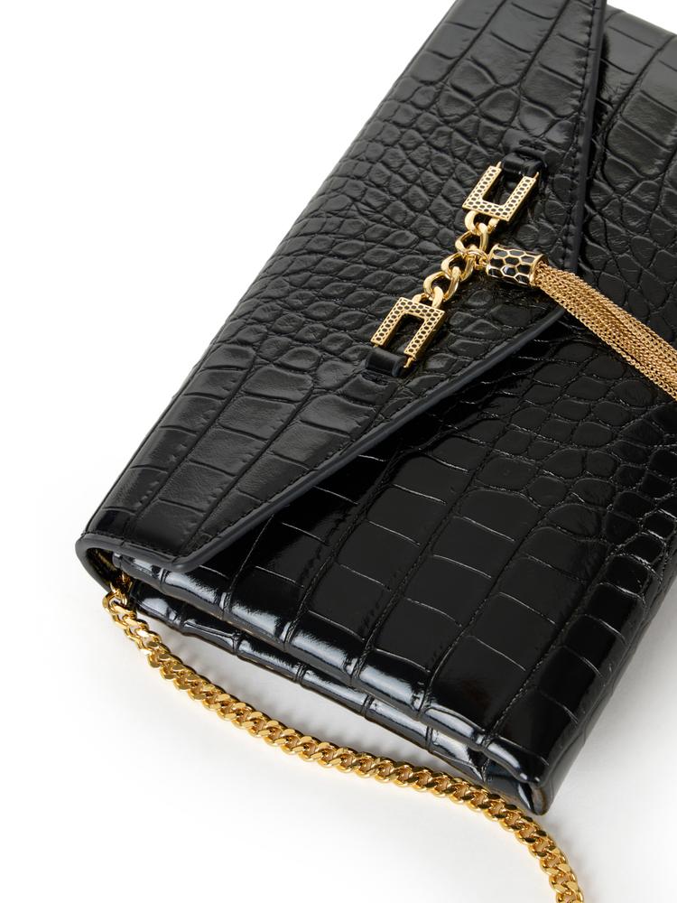 Shoulder bag in synthetic leather-effect material. The crocodile print texture characterises the accessory. With a compact and minimalist shape, it features a shoulder strap with a golden metal groumette chain. It is embellished by the detail with logo and tassel that adds a final touch of light.