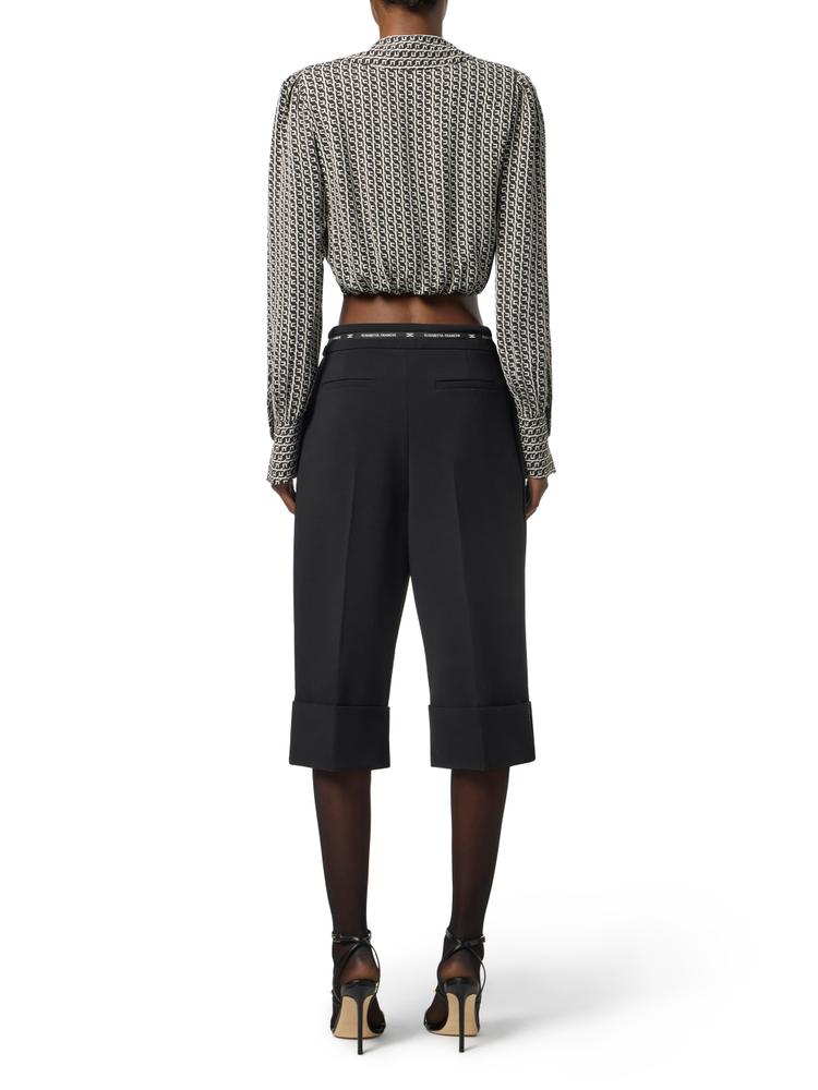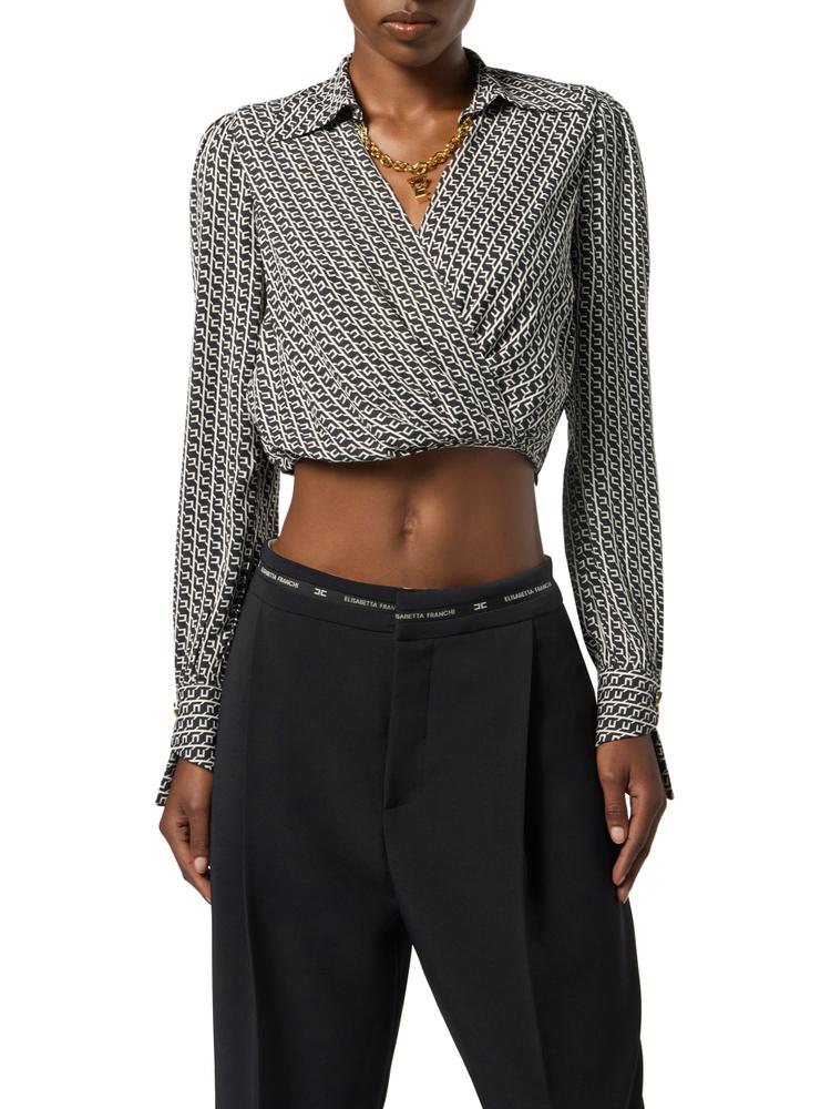 Cropped shirt in georgette fabric with slim fit. It has a shirt collar with a crossover V-neck, long sleeves with asymmetrical cuffs and is illuminated by the jewelled logo chain detail, which can be removed to experiment with many styling options. Enamelled buttons on the cuffs.