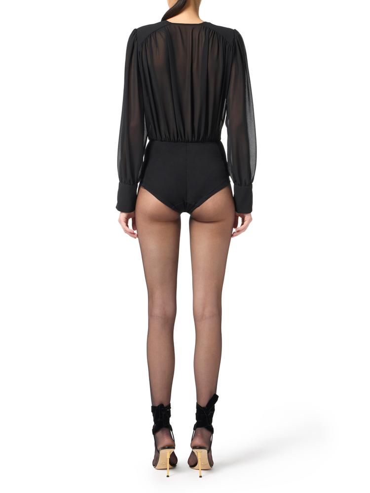 Bodysuit in georgette fabric with slim fit. It has structured shoulders, a v-neck softened by fine draping and long sleeves with wide cuffs and slits embellished with golden metal logo buttons.
