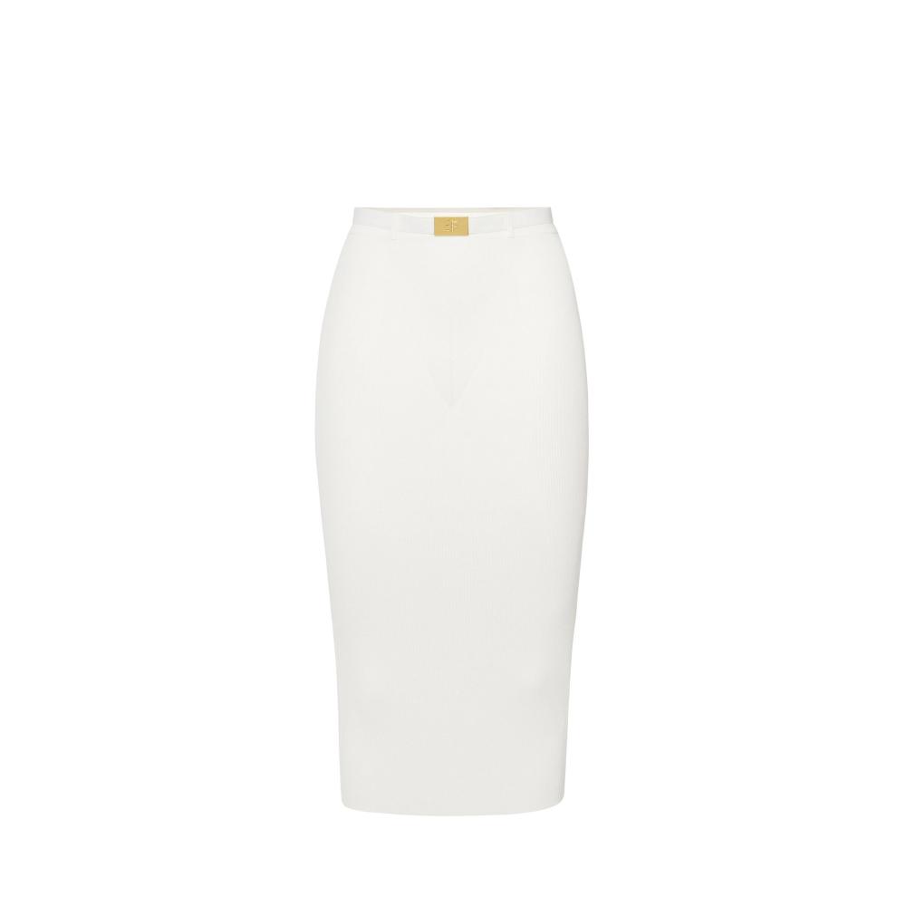 Knit skirt with a slim fit. It stands out for its ribbed knitting that designs the silhouette with geometric patterns on the front. The belt embellished with logo with rhinestones is held in place by matching belt loops and emphasises the waist.