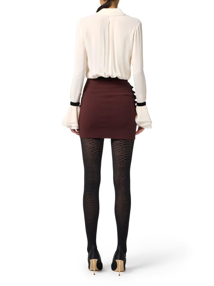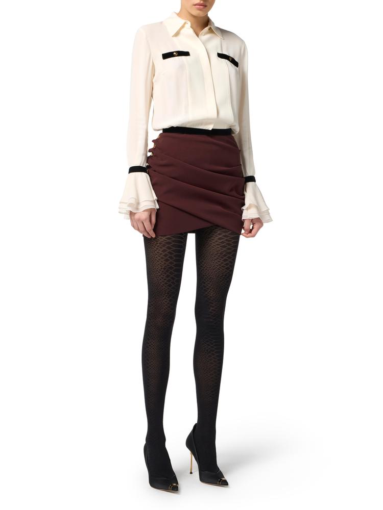 Skirt in lightweight crêpe fabric with slim fit. It is characterised by draping that creates movement, held together with golden metal logo buttons on one side.