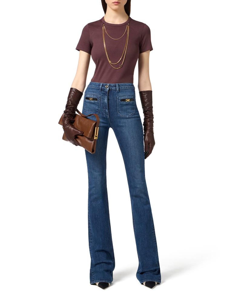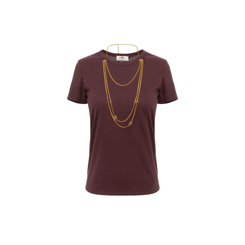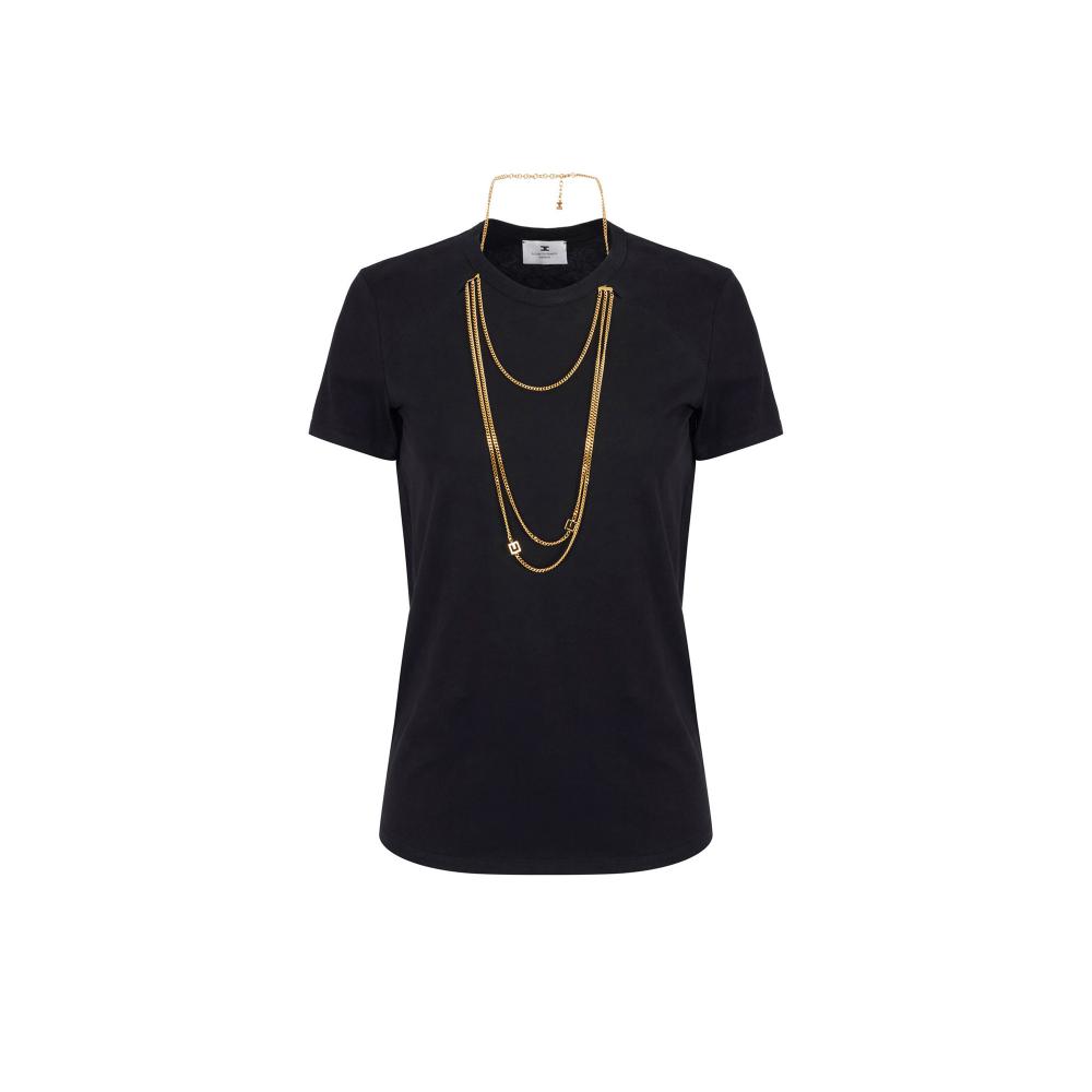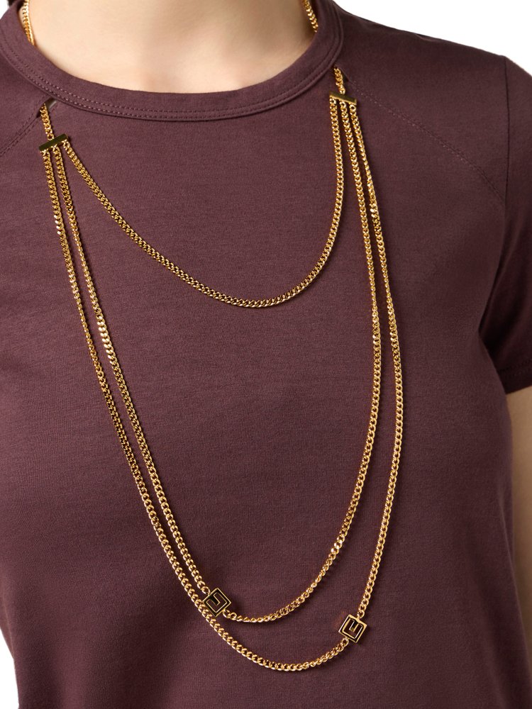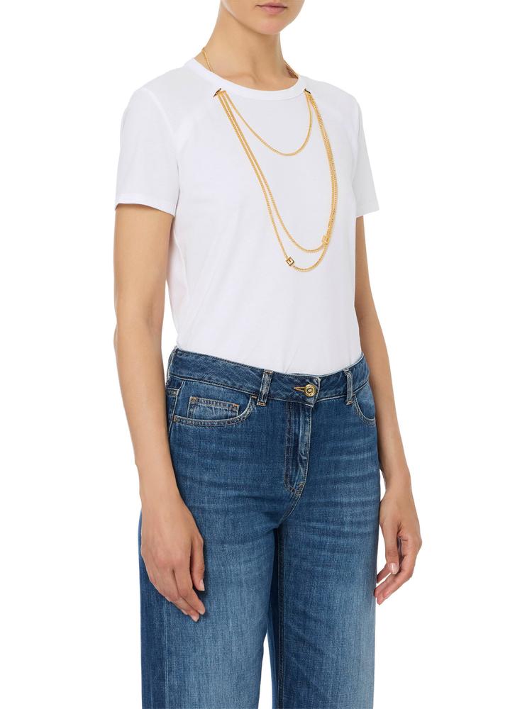 Short-sleeved jersey T-shirt with slim fit. It is embellished with a double-strand necklace with logo, held in place by loops in the shoulder cut.