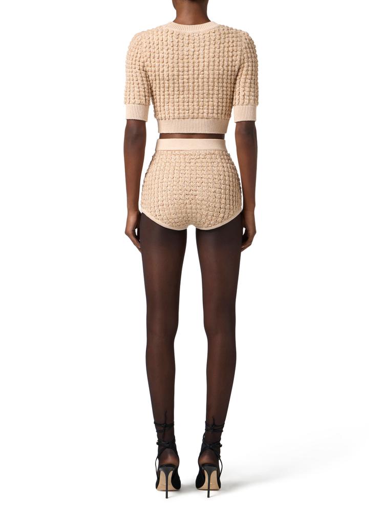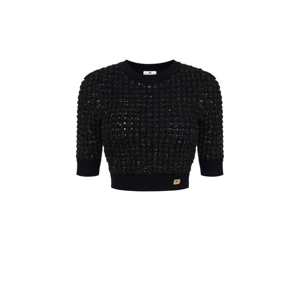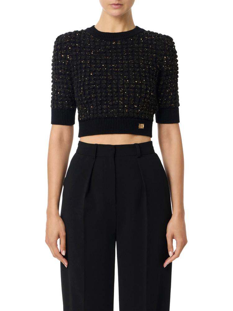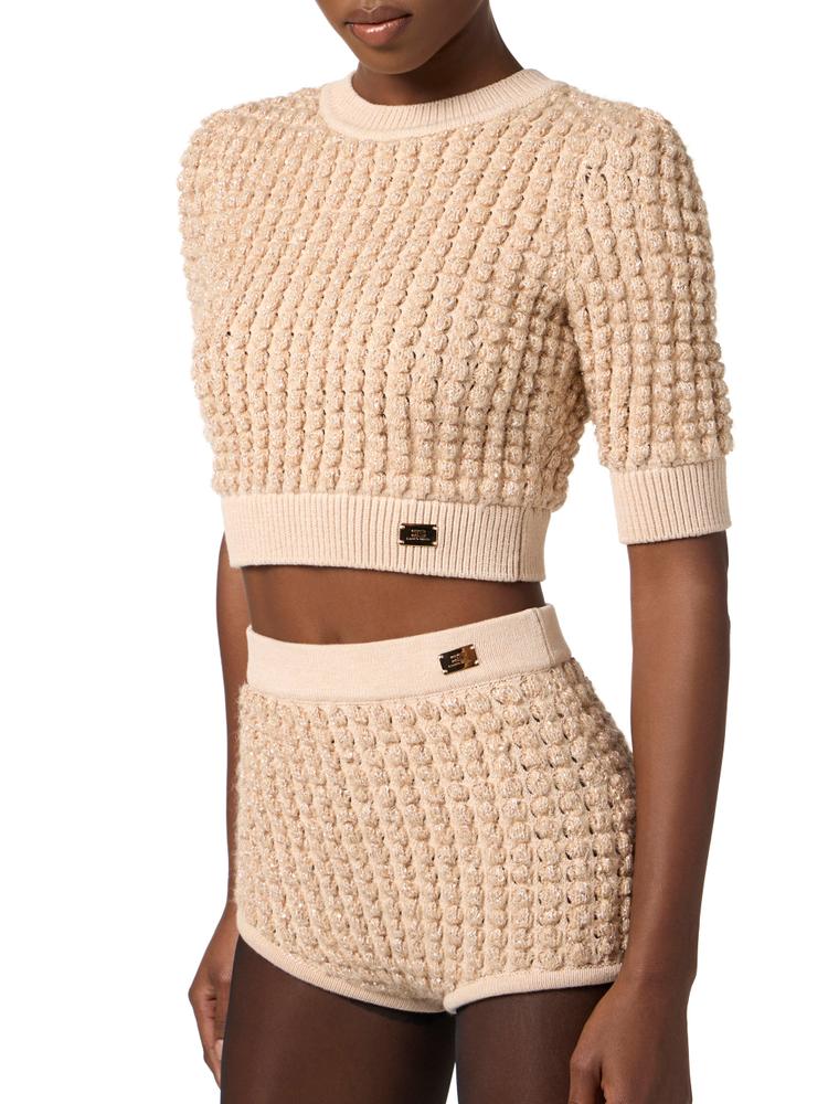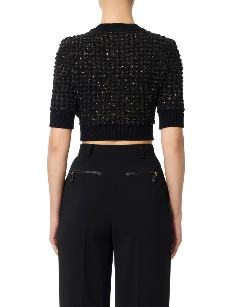 Bouclé knit top with a slim fit. Embellished with micro-sequins sewn into the weave, it has a crew neck, above-the-elbow sleeves and cropped waist with ribbed finish. A final touch of light is provided by the logo plaque on the side.