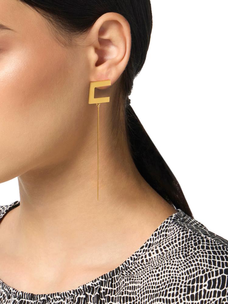 Golden metal earrings with a golden finish, featuring the dangling bar with an essential design. Closure with needle.