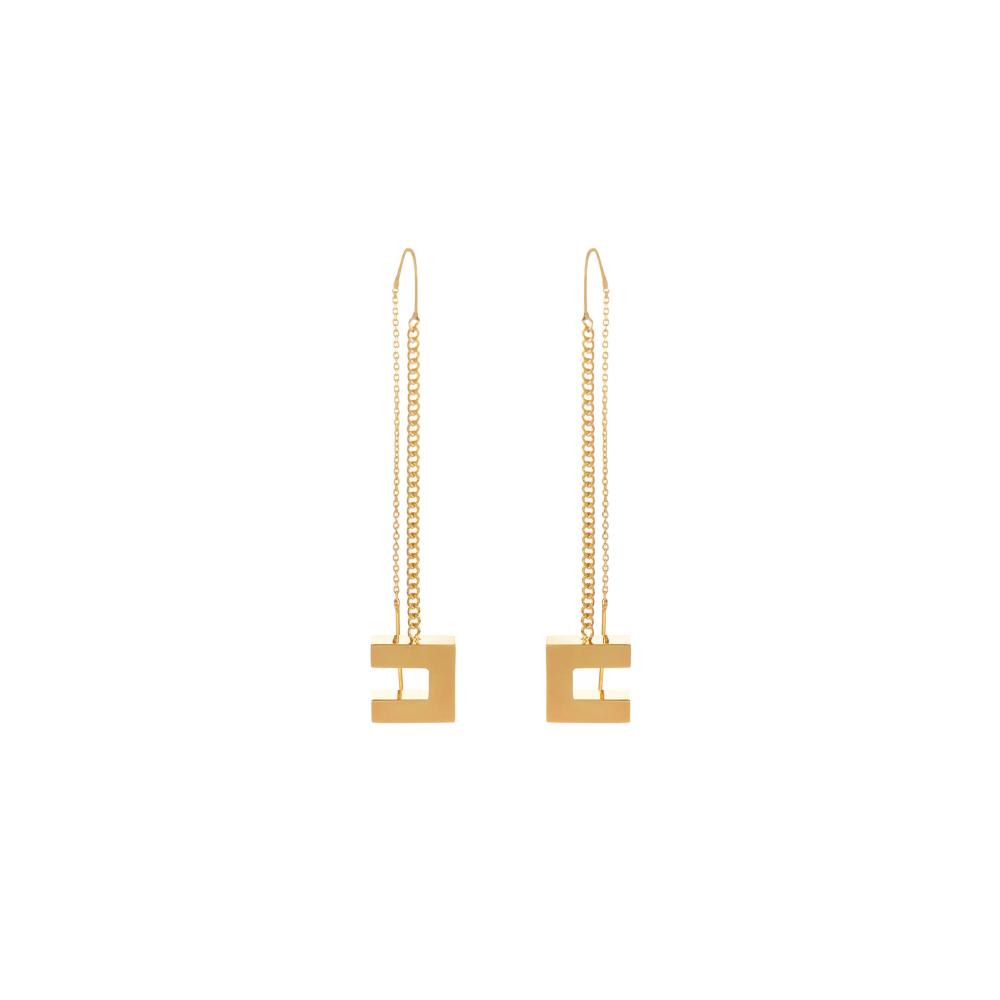 Metal earrings with a golden finish featuring the dangling chain with logo on one end.