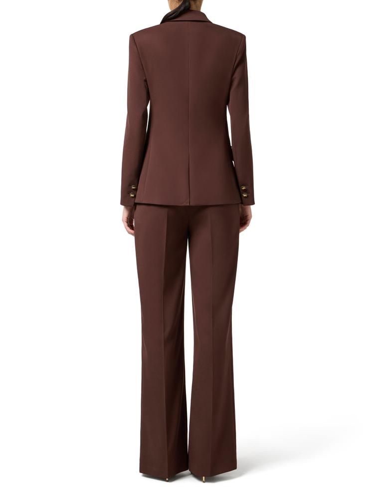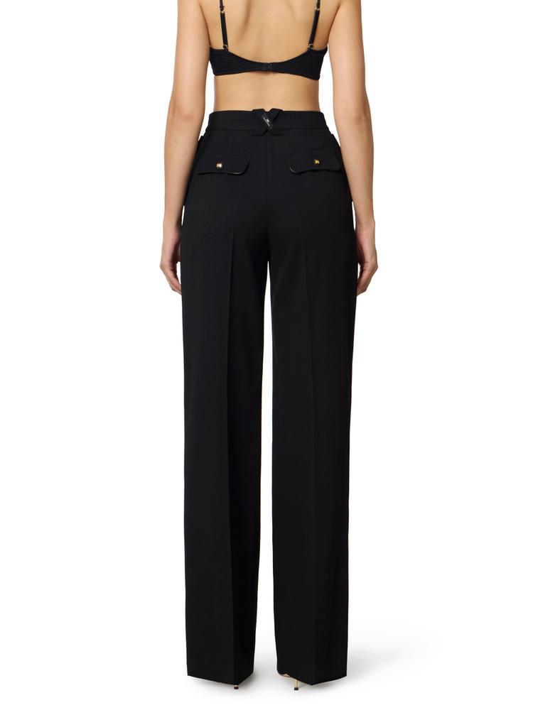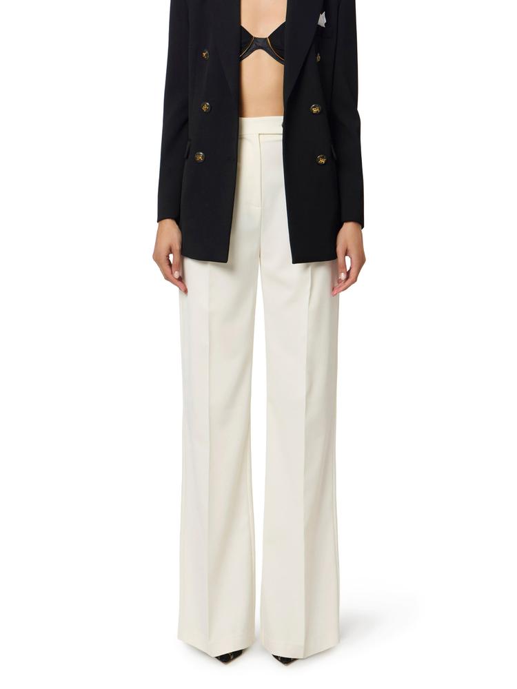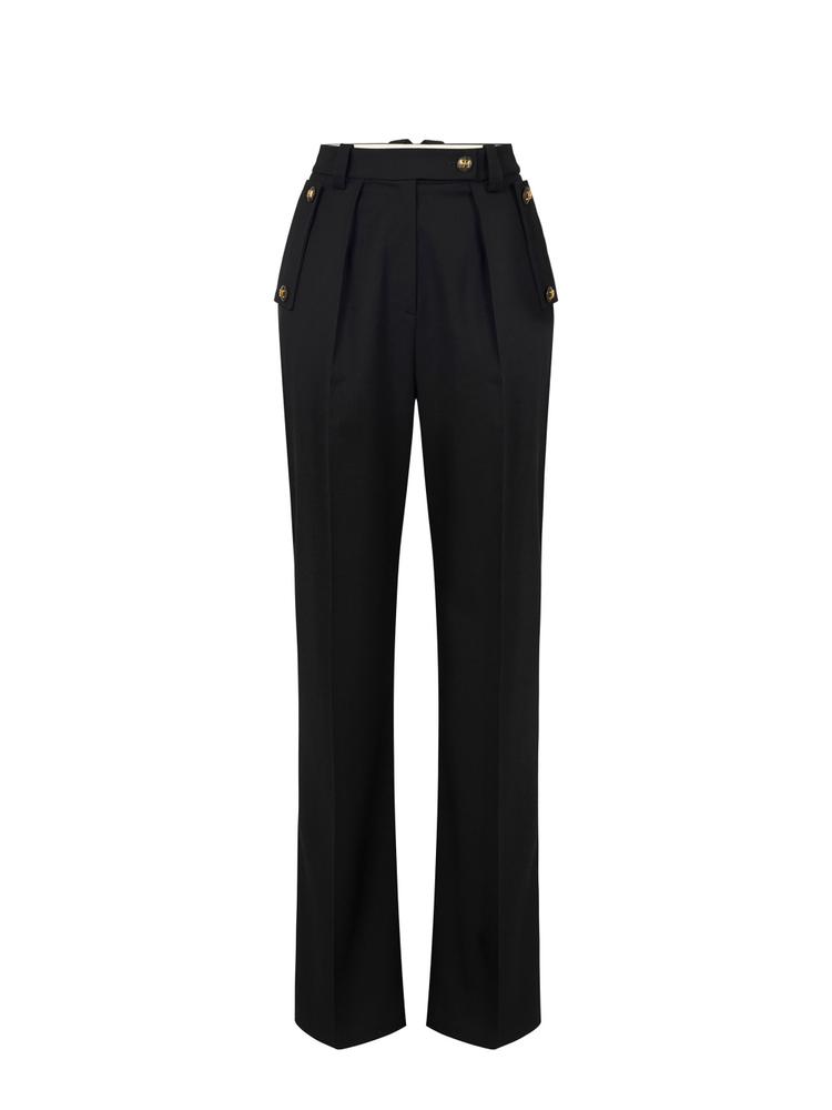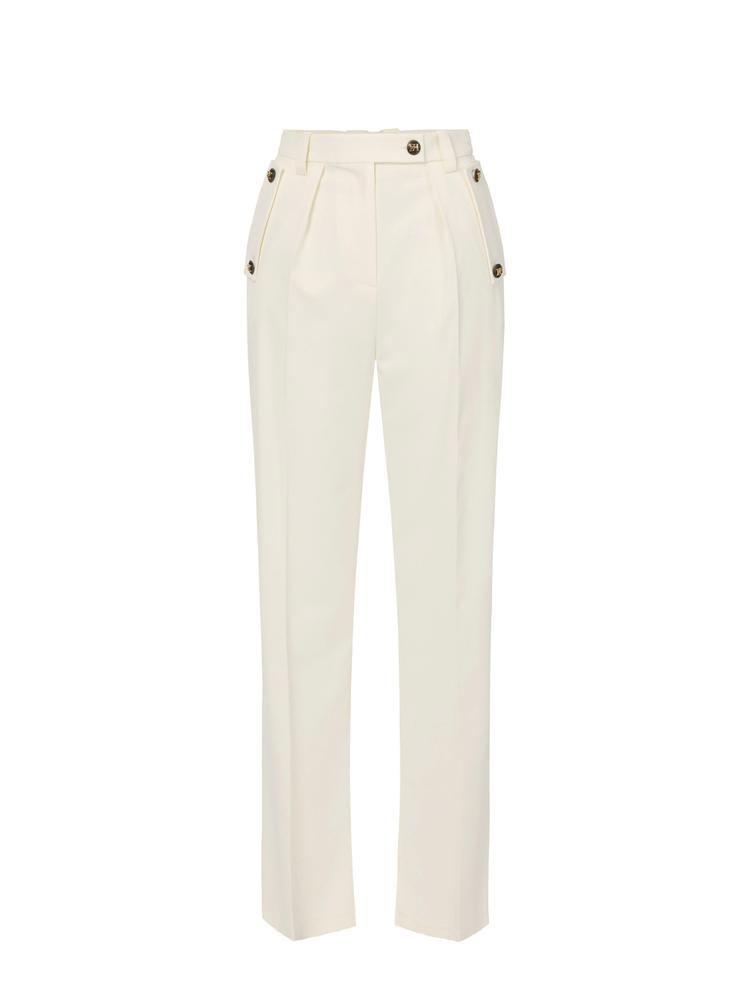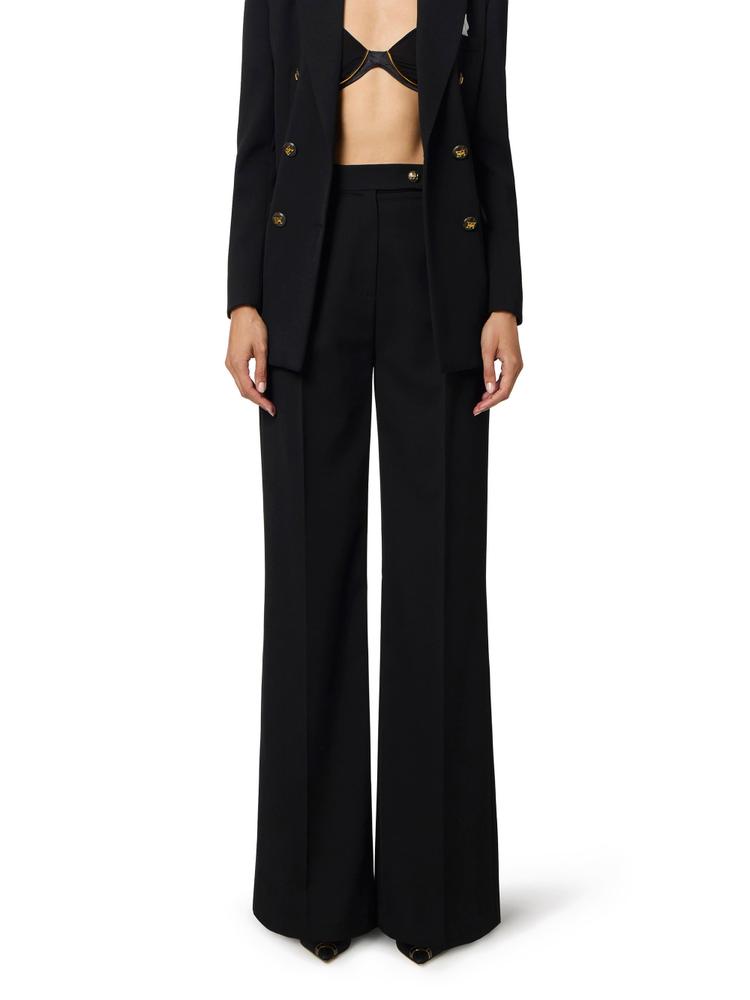 Cotton gabardine trousers. Decorated with logo buttons that enhance the waist and pockets, they have a palazzo fit with deep darts shifting the focus on volume. Logo label on the back loop. Oversized fit.