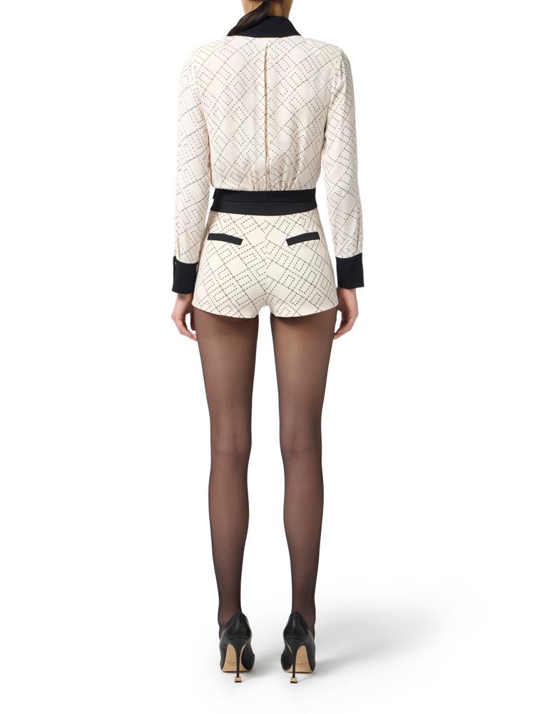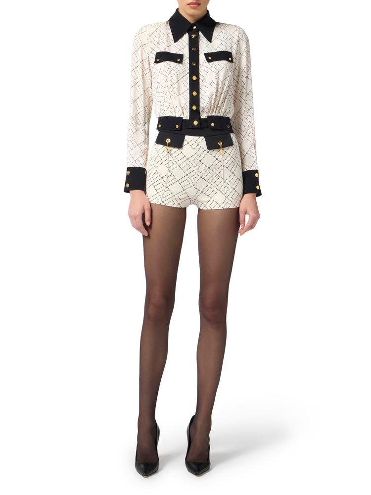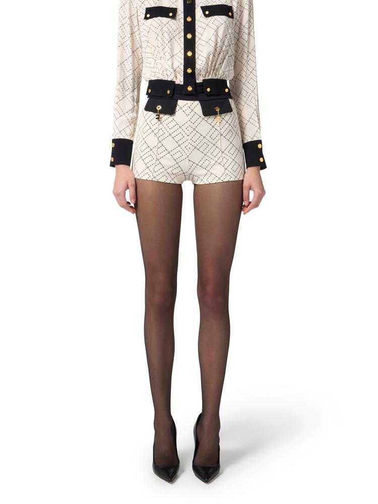Slim fit shorts in double-layer crêpe fabric. They are characterised by contrasting colour details and collection print for a refined two-colour pattern. The cufflinks with chain and logo charm add movement and light. Welts on the back.