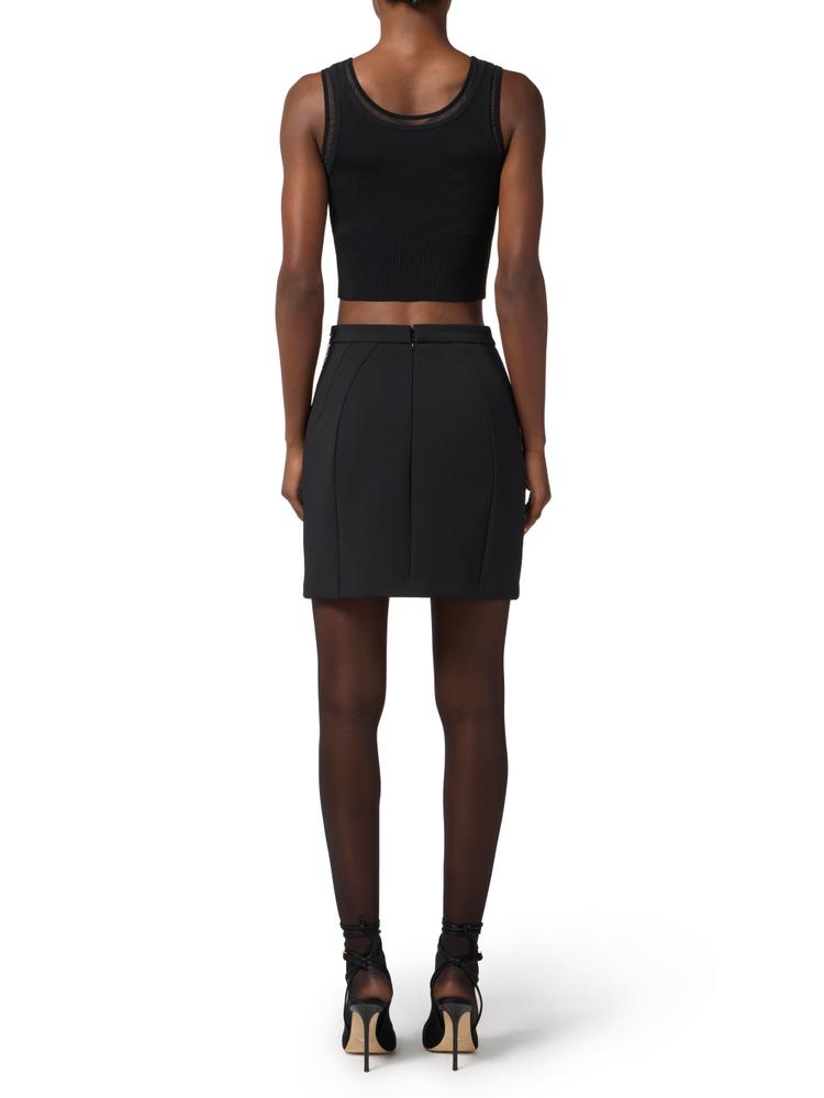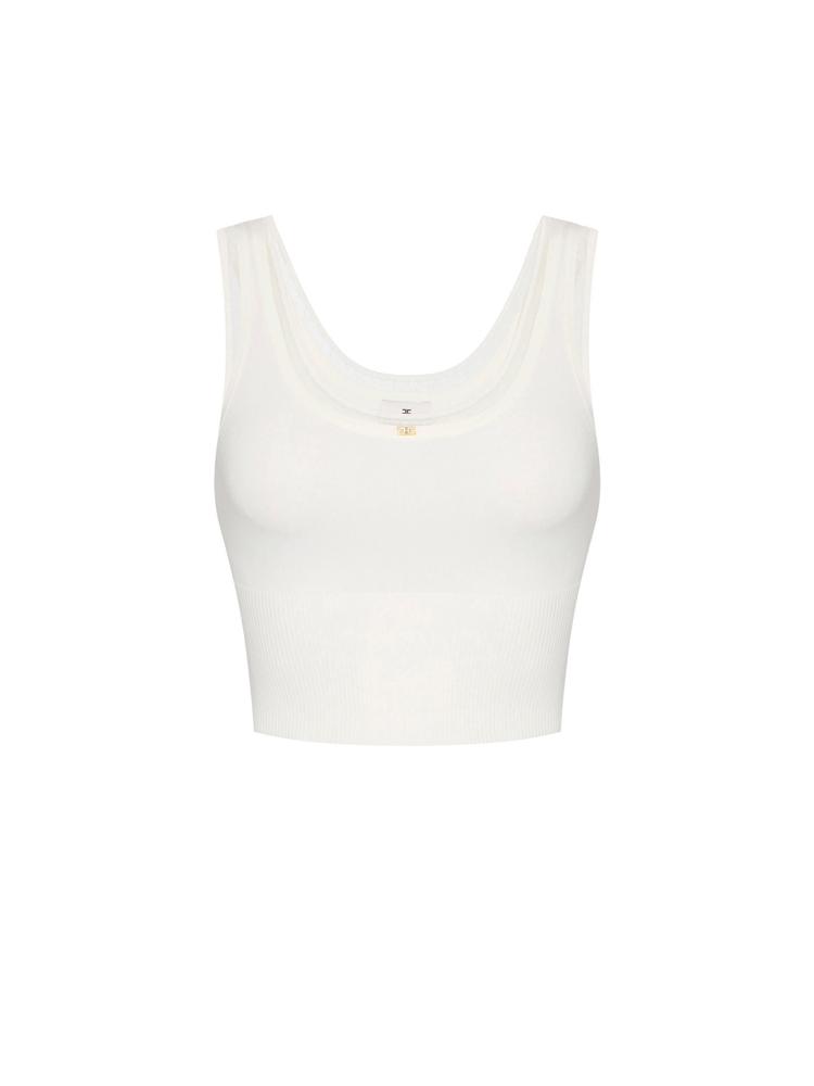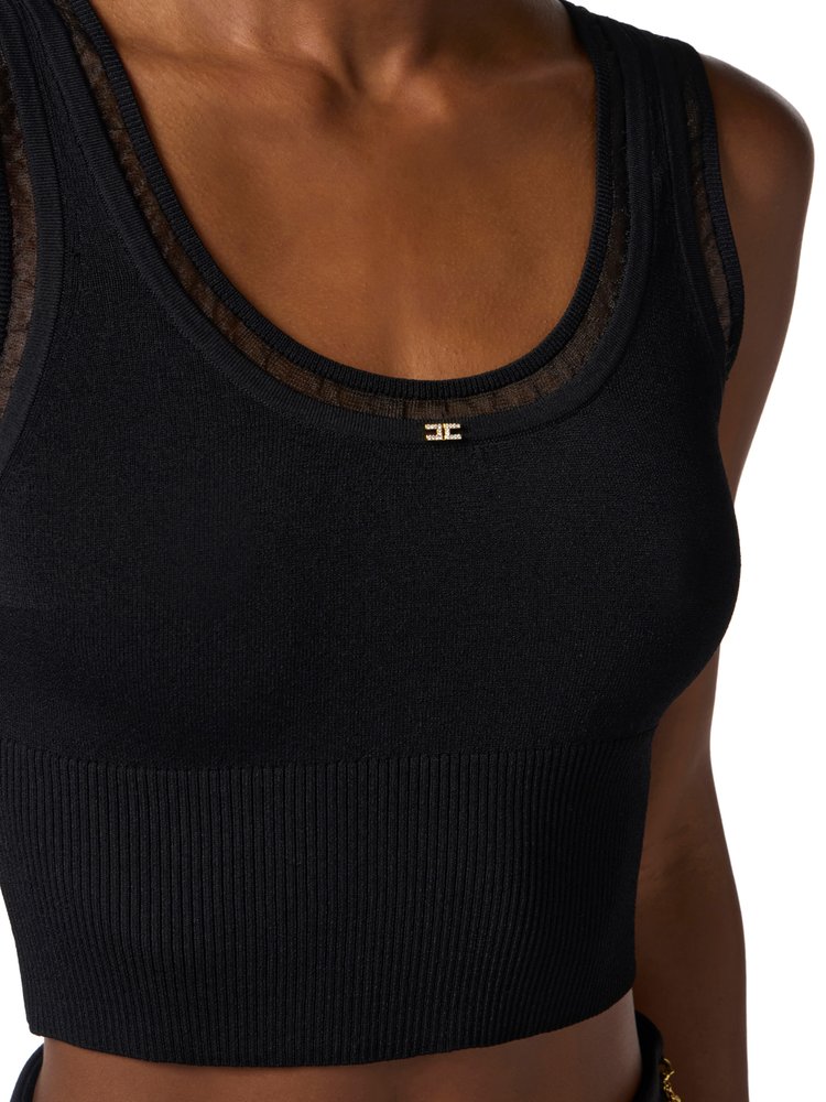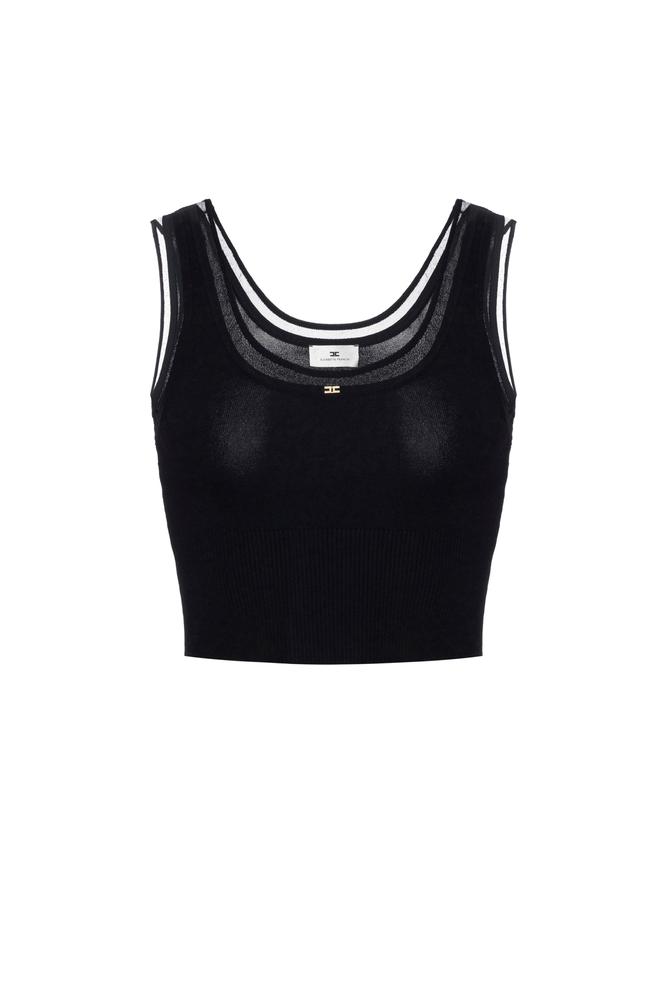 Knit top with a slim fit. With a wide neckline, it is ribbed at the waist and has contrasting nylon piping that creates special see-through effects. A small jewel logo with rhinestones adds a touch of light.