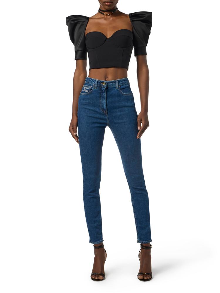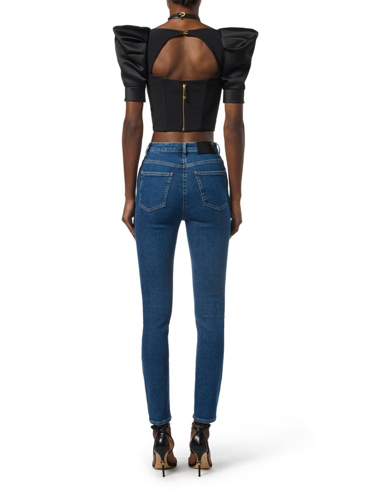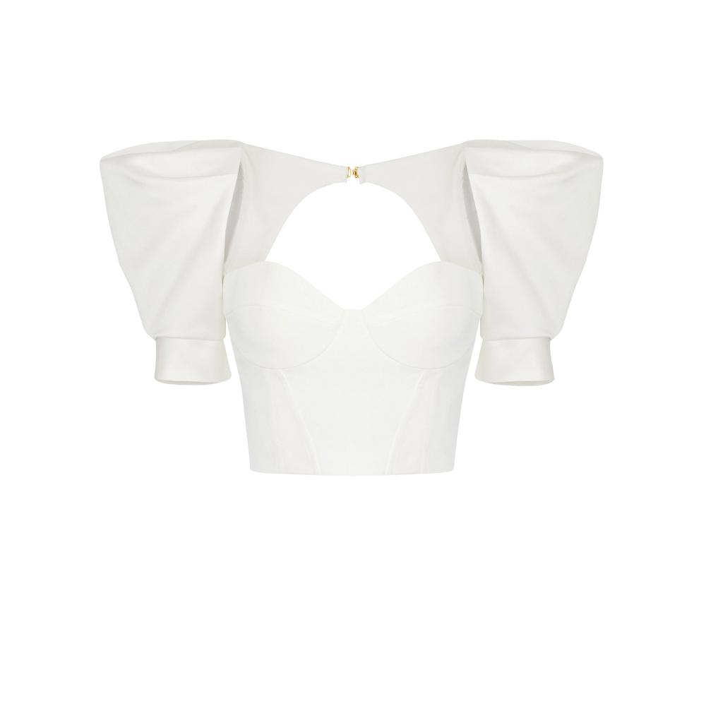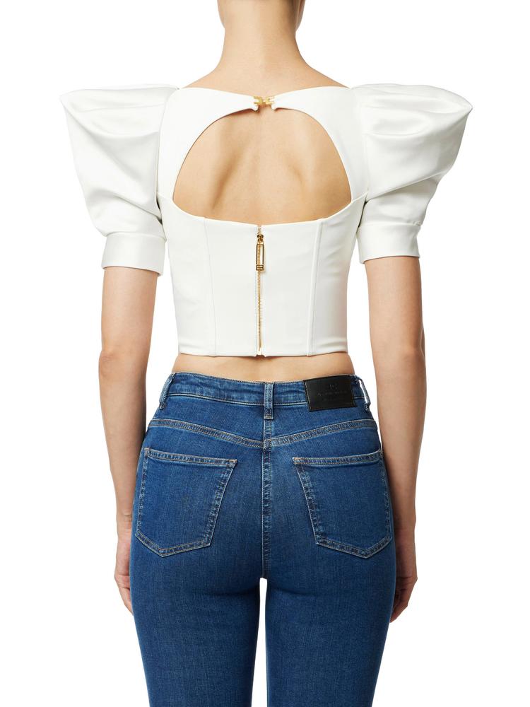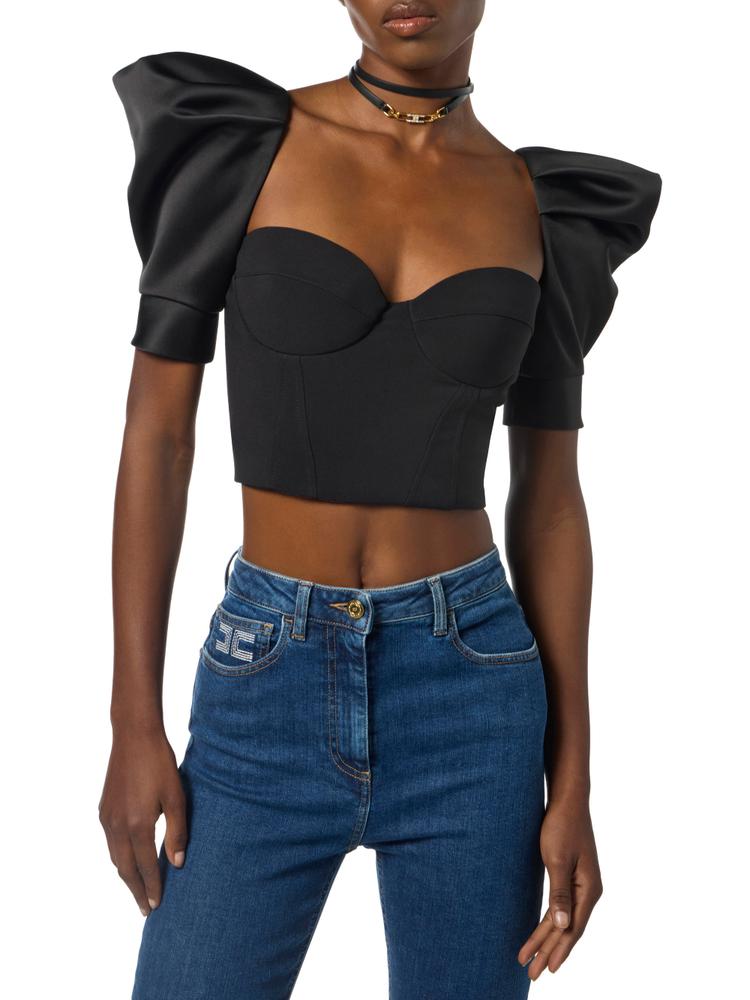 Top in crêpe and duchess satin fabrics. It stands out for its wide balloon sleeves, constructed with pleated workmanship for striking volumes. Shaped bustier-inspired cuts give structure to the cups and hips. Slim fit.