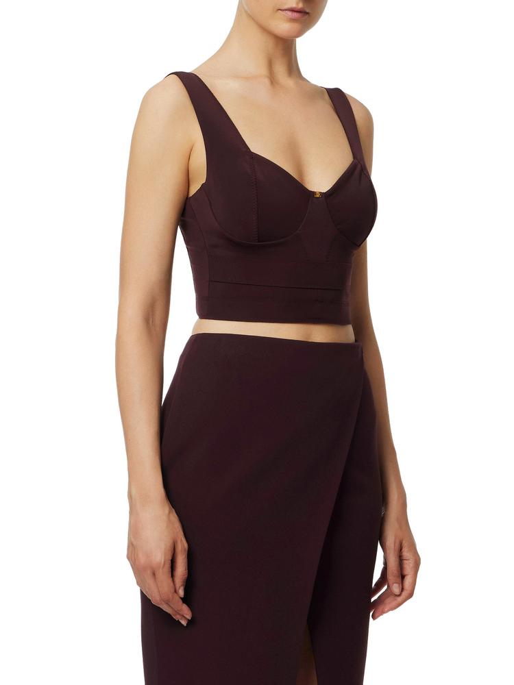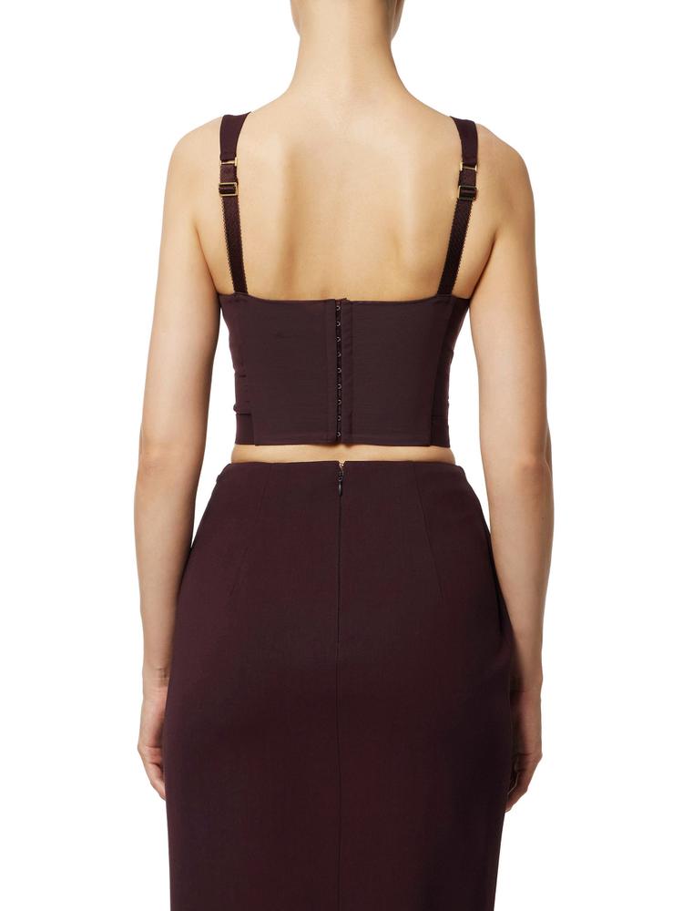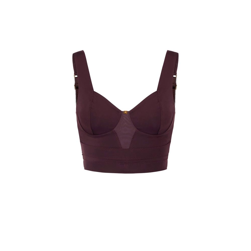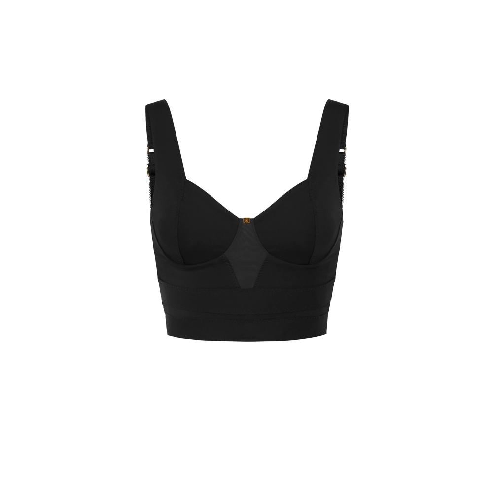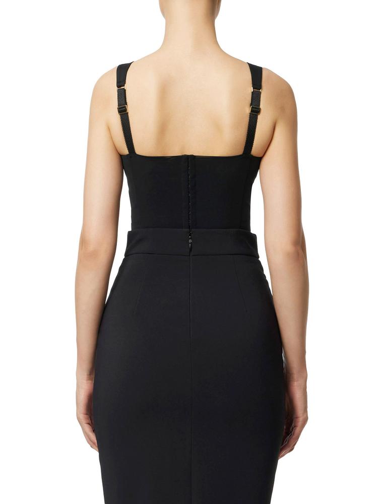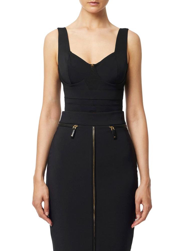 Top in bi-elastic fabric with slim fit. It echoes the world of corsetry with zigzag topstitching and cuts with a bustier effect, sculpting the silhouette. Tulle inserts and a logo detail complete the garment.