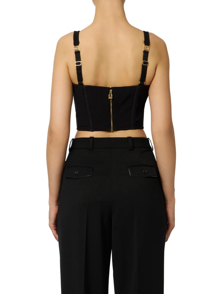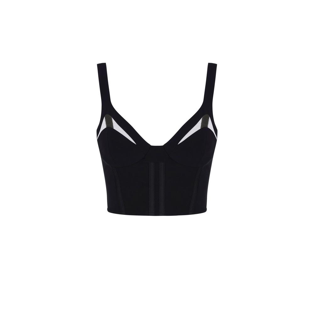 Lightweight crêpe top with a slim fit and adjustable straps. It echoes corsetry-style patterns such as satin ribbons topstitched with a bustier effect, sculpting the silhouette. The cups are defined by cut-outs covered with tulle segments for a purposeful nude effect.