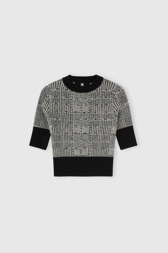 Half-sleeve sweater in wool blend with pied de poule jacquard and crystals- Regular price