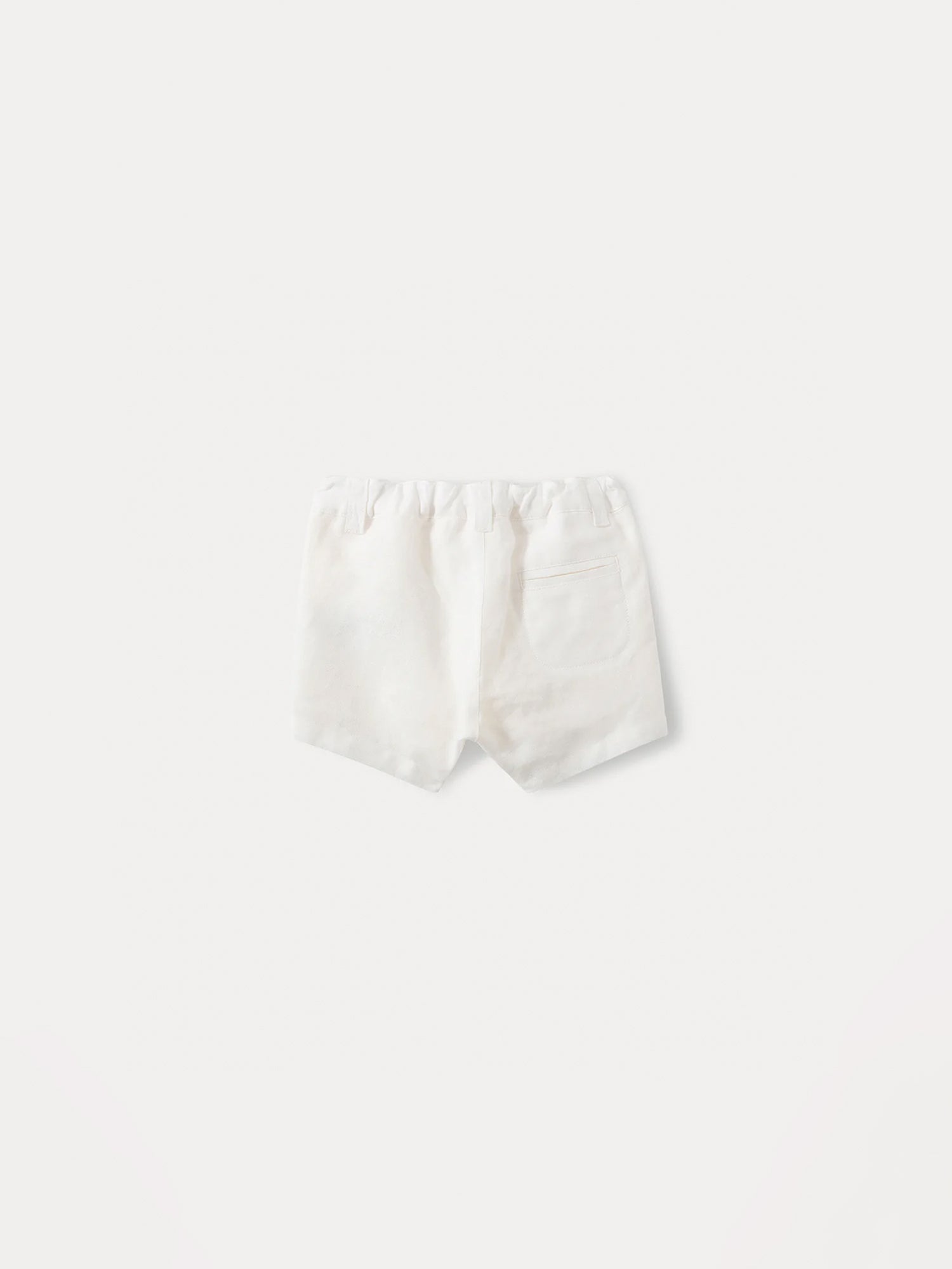 These Academy shorts are styled in 100% white linen. Their clean lines giving a subtly retro look. They have a zip and button fastening, two vertical welt pockets on the front and a welt and button pocket at the back. Combine them with a printed cotton bodysuit and a bucket hat.