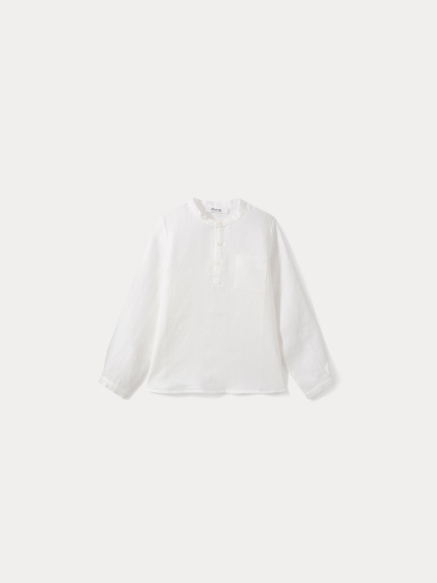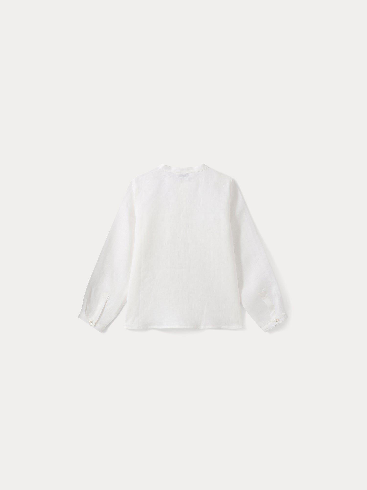 The Artiste tunic evokes both an Asian shirt and an artist's blouse. In white linen, it has a Tunisian collar, sleeves buttoned at the cuffs, and a patch pocket on the chest.