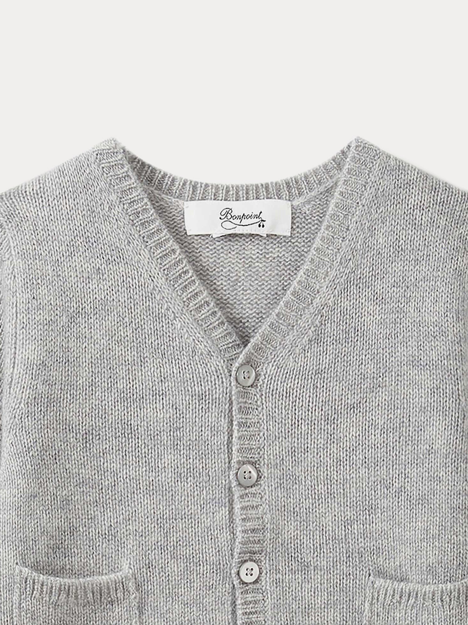 We love the simple classic look of this cashmere babies' cardigan. A pretty light heathered gray jersey garment, it features a V-neck and two small pockets at the front, for a natural and delicate style.