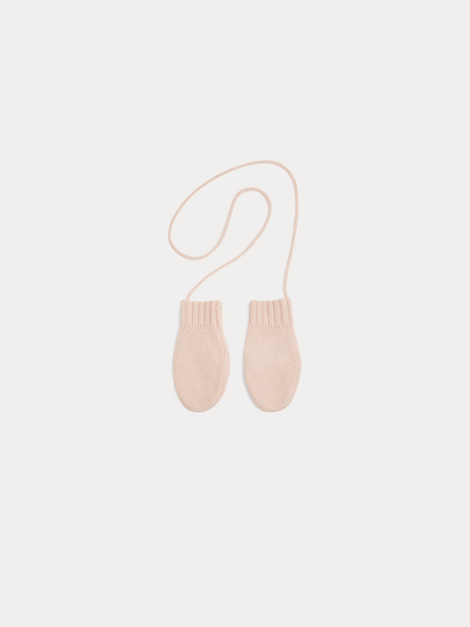 These adorable cashmere babies' mittens with ribbed cuffs will keep baby's hands nice and warm. We like the retro side of these pale pink accessories, which are connected by a string.