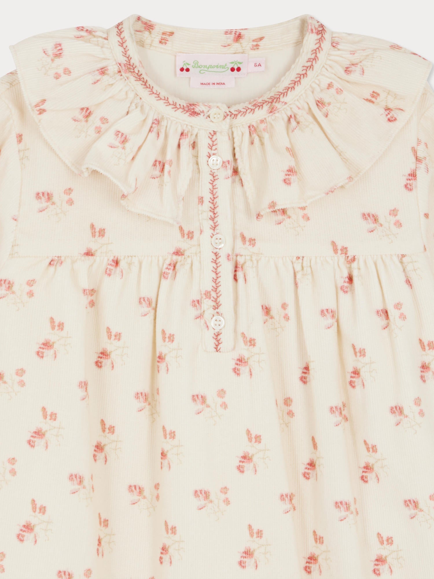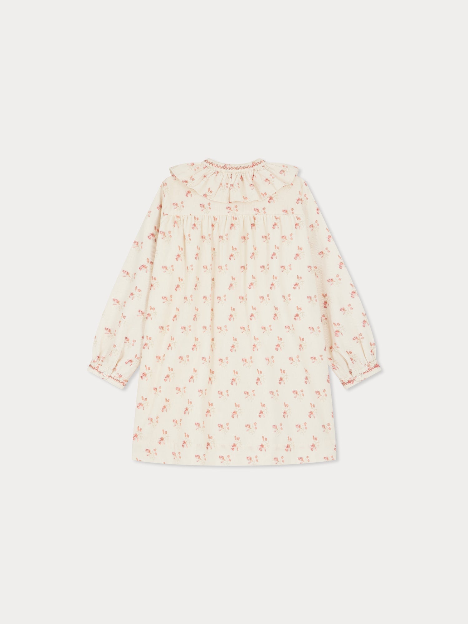 This Joana dress for girls combines comfort and style with a romantic vibe. It features a fresh floral motif, with a wide ruffled collar enhanced by light gathering adding to its charm. Made from cotton, it has an organic cotton lining for optimal comfort and a button tab at the neckline for a practical touch.