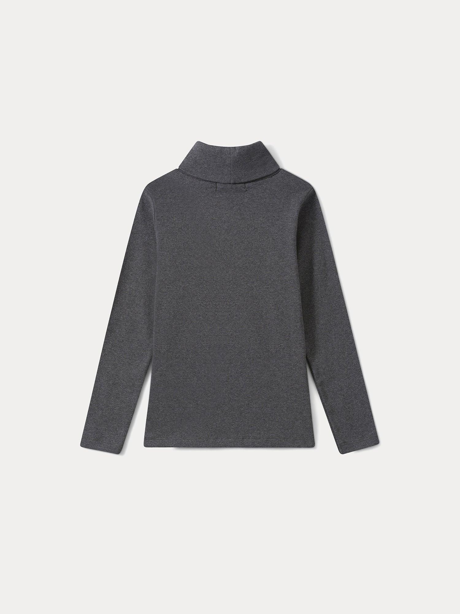 We like the understated, elegant quality of this thin turtleneck sweater. The heathered gray, long-sleeved cotton garment is perfect for winter outfits. Tuck it into pink velvet pants for an on-trend vintage look.