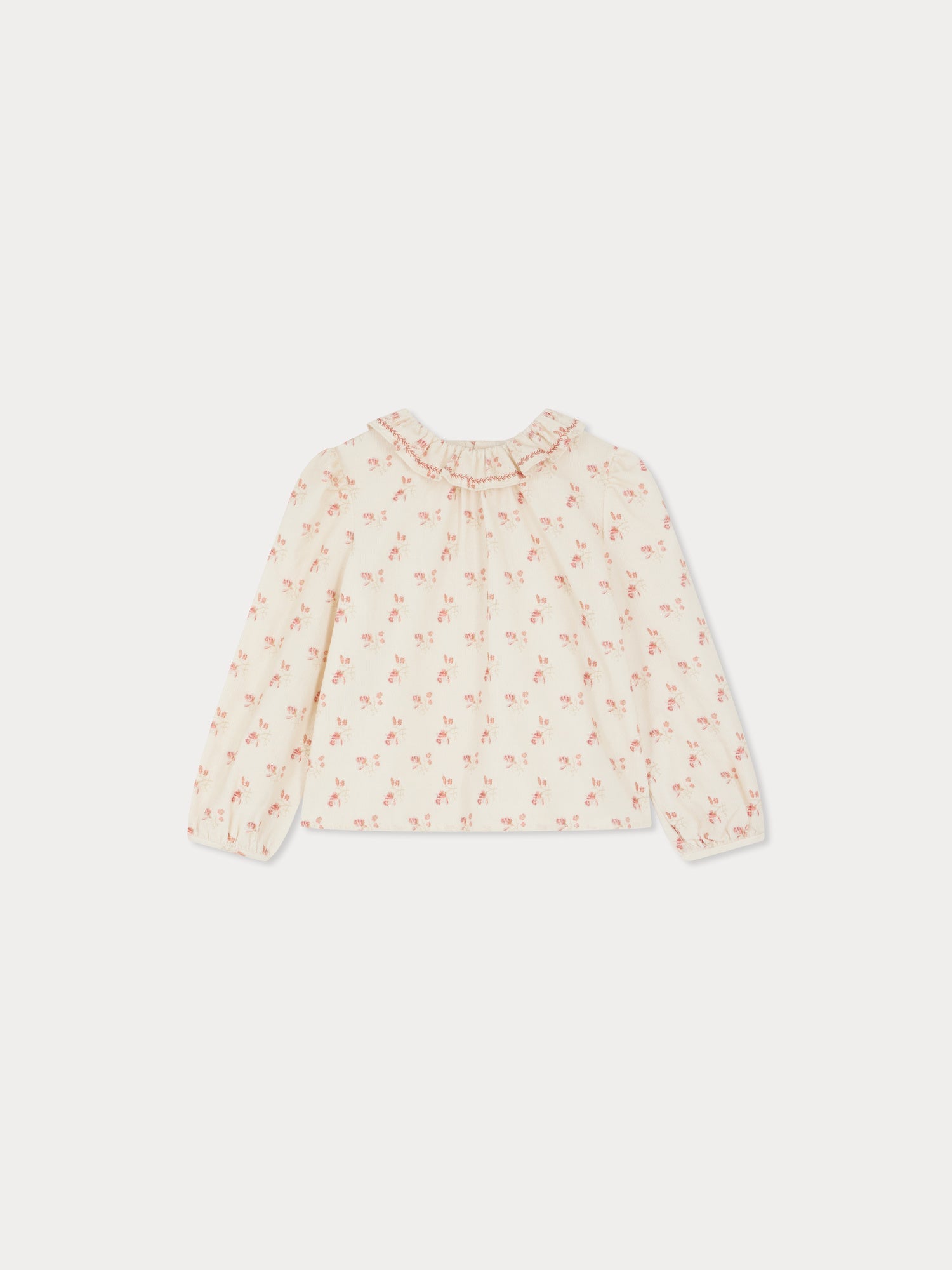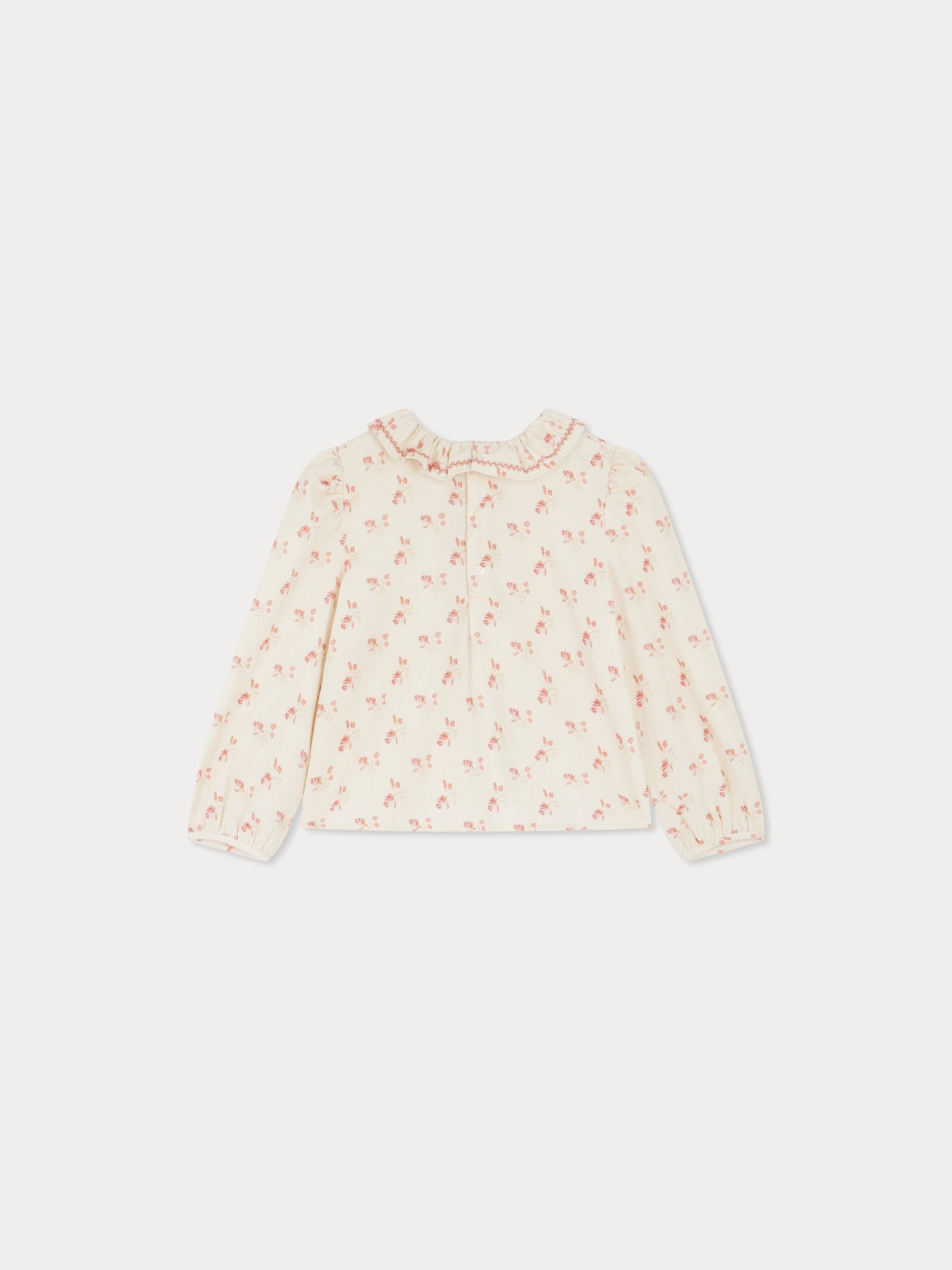 The Timber blouse for girls is made from comfortable yet sophisticated cotton corduroy. It is printed all over with the iconic Bonpoint cherry in pastel shades, with a hand-embroidered ruffled collar adding to its romantic charm. It fastens at the back with delicate mother-of-pearl buttons.