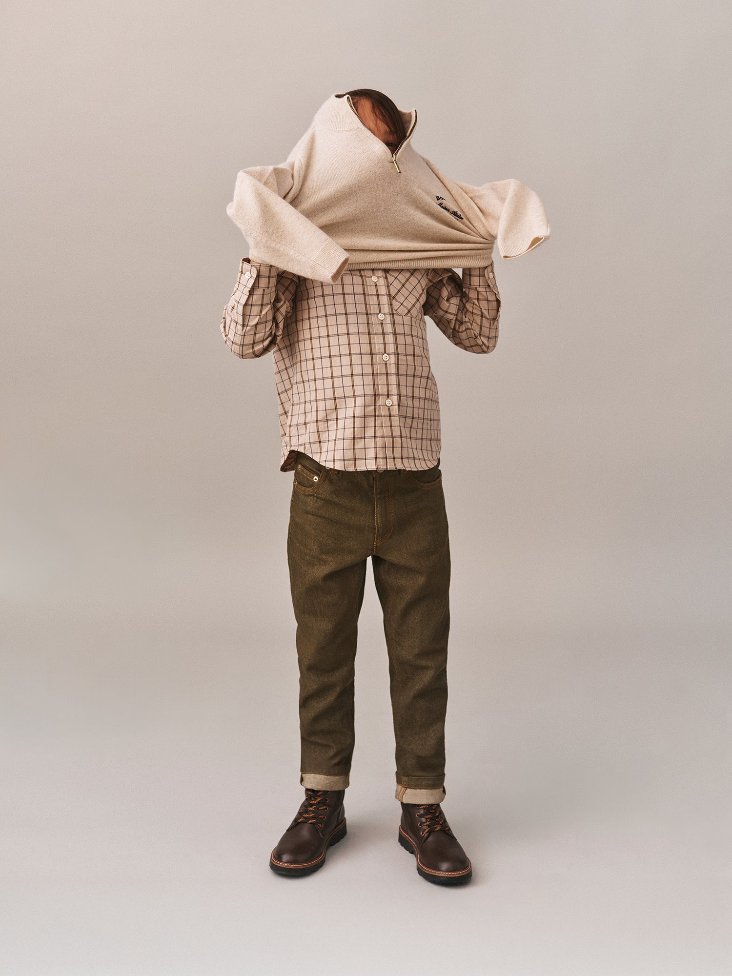Beige plaid pointed collar tango shirt