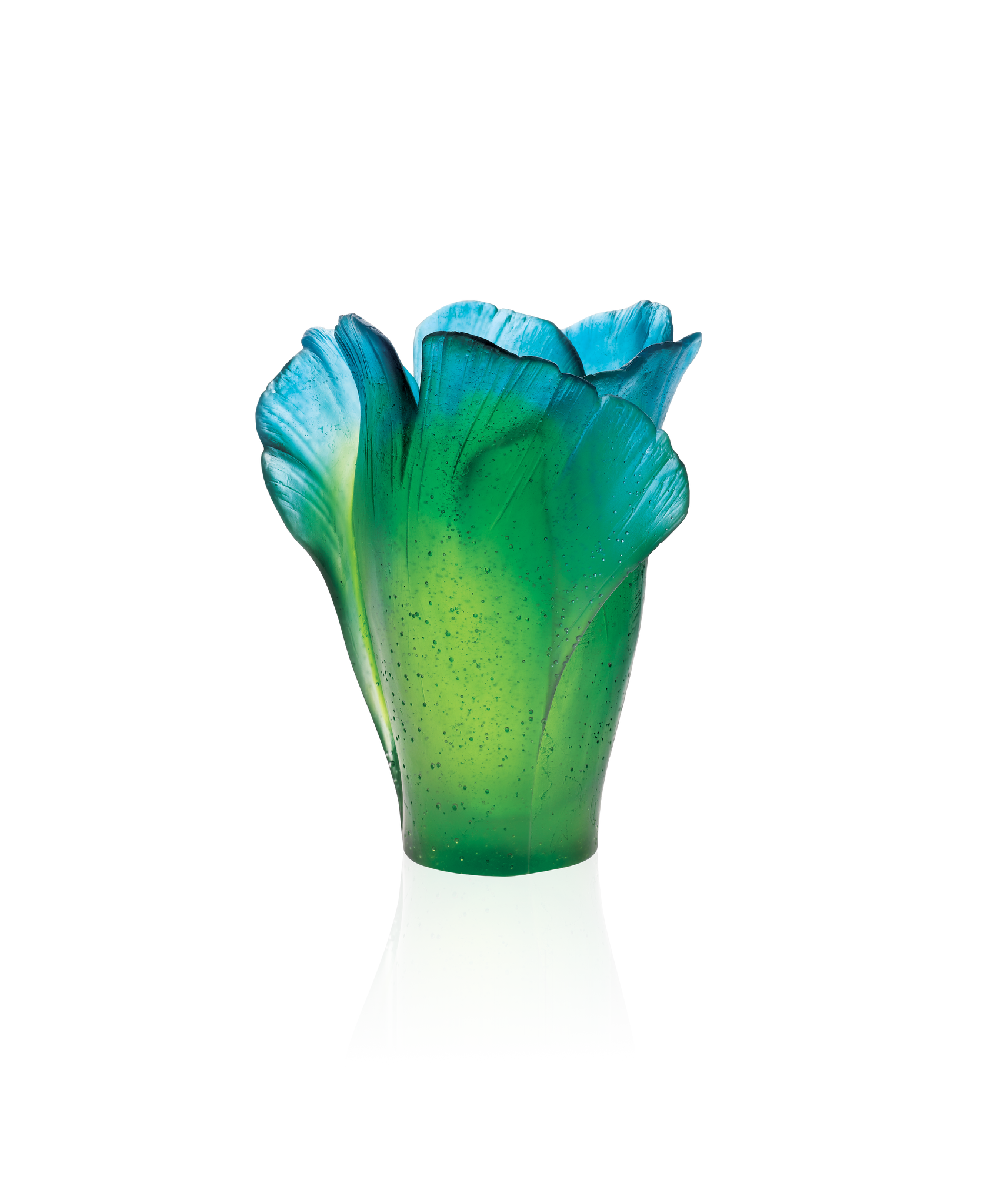 Inspired by the leaves of the Ginkgo tree, this object evokes the serenity of Japanese gardens. Made using a centuries-old technique, this glass paste vase in shades of blue-green offers a meeting point between art and nature. Its nuanced transparency and graceful curves capture and diffuse light, creating a calming atmosphere. Empty or filled with flowers, this Daum vase is an invitation to contemplation.