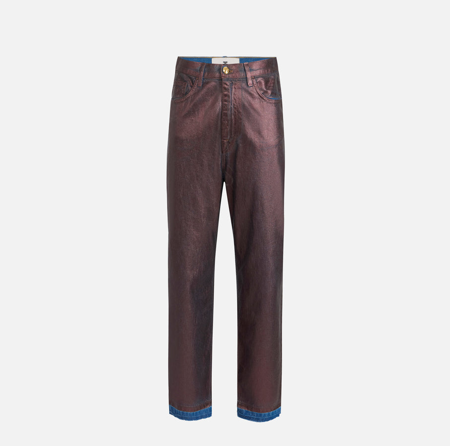 Laminated cotton denim baggy trousers